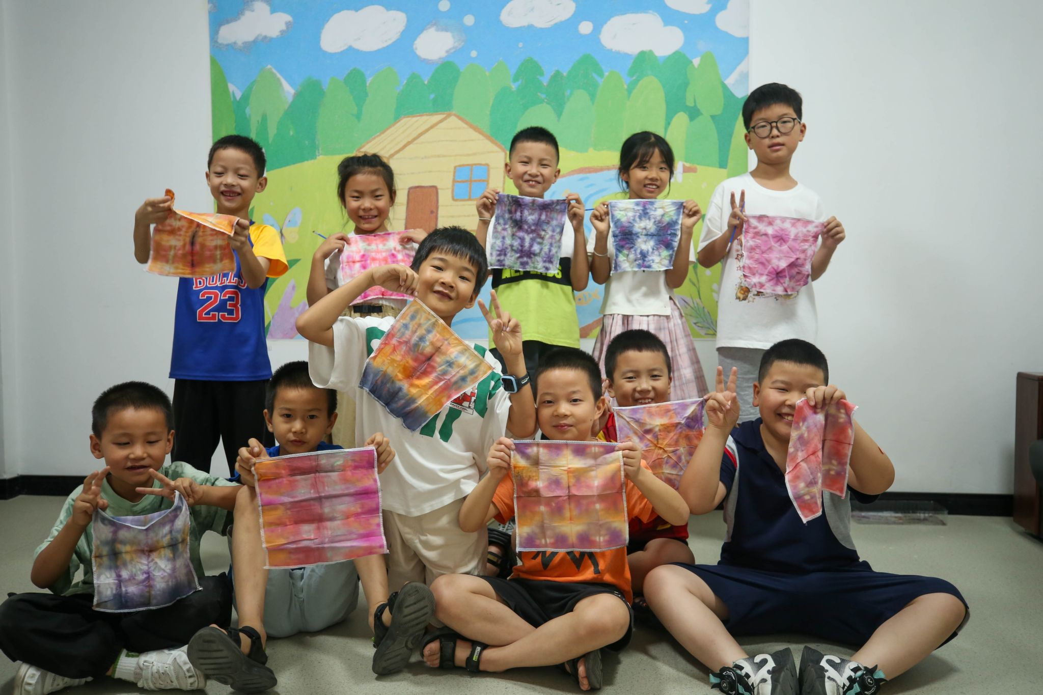 扎染课程则以艺术实践为纽带,实现了规则意识与法治精神的具象化传递。实践队从捆扎技法到染色流程,引导孩子们亲手体验这项非遗技艺的完整制作过程。孩子们使用皮筋、木夹等工具进行捆扎,随后浸入染缸完成染色,观察布料在化学反应中形成的花纹变化。“正如捆扎的松紧决定图案的疏密,法律的宽严相济才能守护社会公平”,实践队队员的生动比喻让孩子们在艺术创作中领悟规则的重要性。
