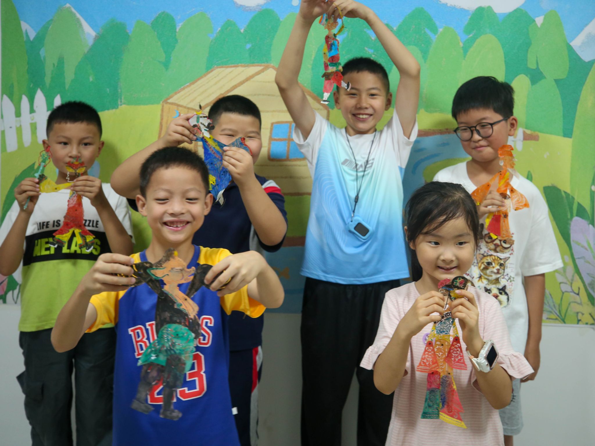 在皮影课上,队员们为同学们介绍皮影戏的历史渊源、派系类别、制作工艺,同时为孩子们展示与现代动画技术相结合的经典皮影戏《三打白骨精》。《三打白骨精》通过光影投射的动态对比,既保留了皮影戏独特的艺术韵味,又以更生动的视觉效果增强故事的吸引力。在课程的结尾,孩子们在队员的指导下分组制作简易皮影,体验“敷彩”与“缀结”,并自编自演儿童版法治小故事,在光影交错中领悟非遗艺术的匠心传承。