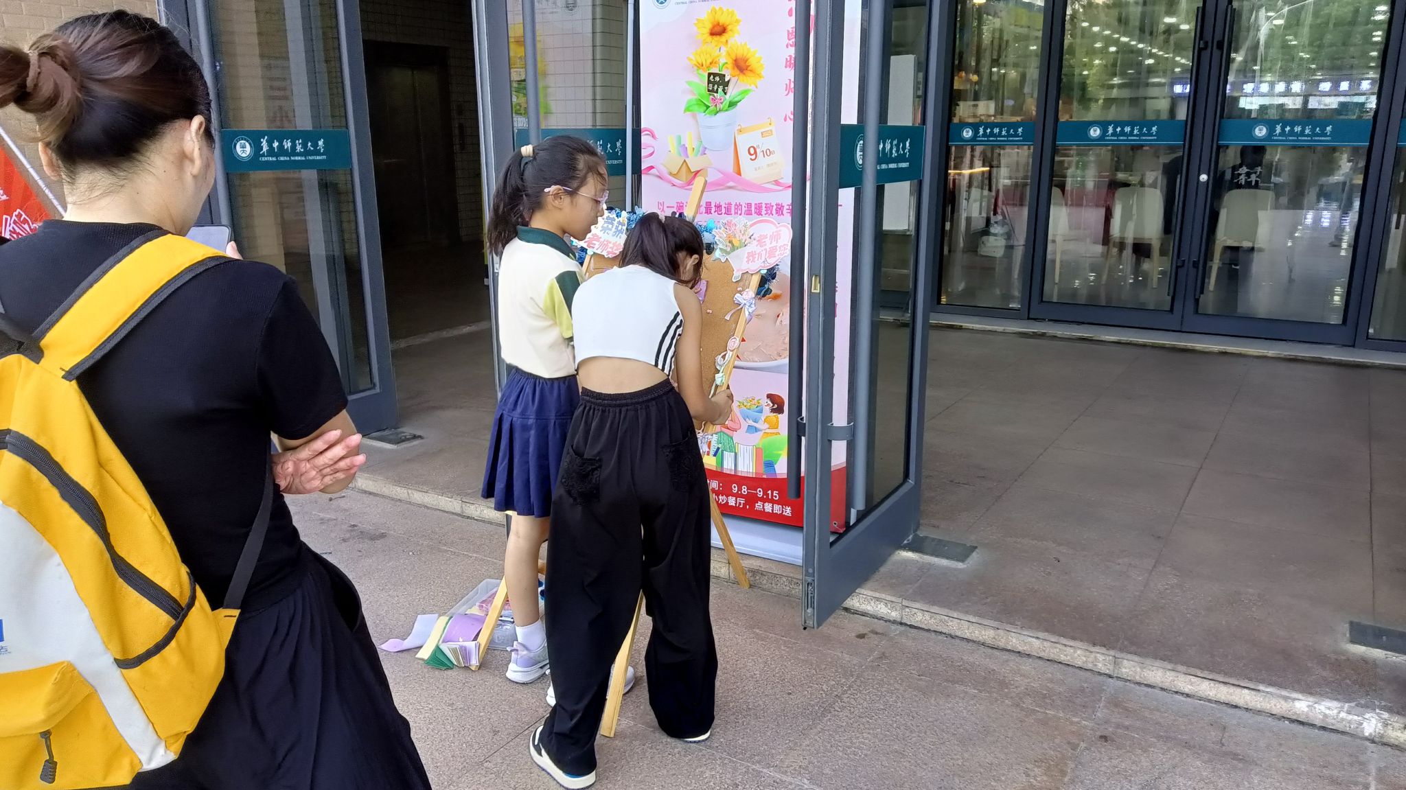 9月9日至11日,“诗歌接力活动”分别在南湖食堂门口和南湖综合楼N119旁开展。活动以展板为载体搭建创作平台,同学们以笔墨书写师恩,用诗句传递敬意。活动现场,同学们争相参与,执笔凝思,于一方诗板挥毫写下百般衷情。一笺一语,皆蕴心声;一字一句,俱载深情。短短三日,诗歌铺满展板,无言之中,感恩之情在诗意中流淌。