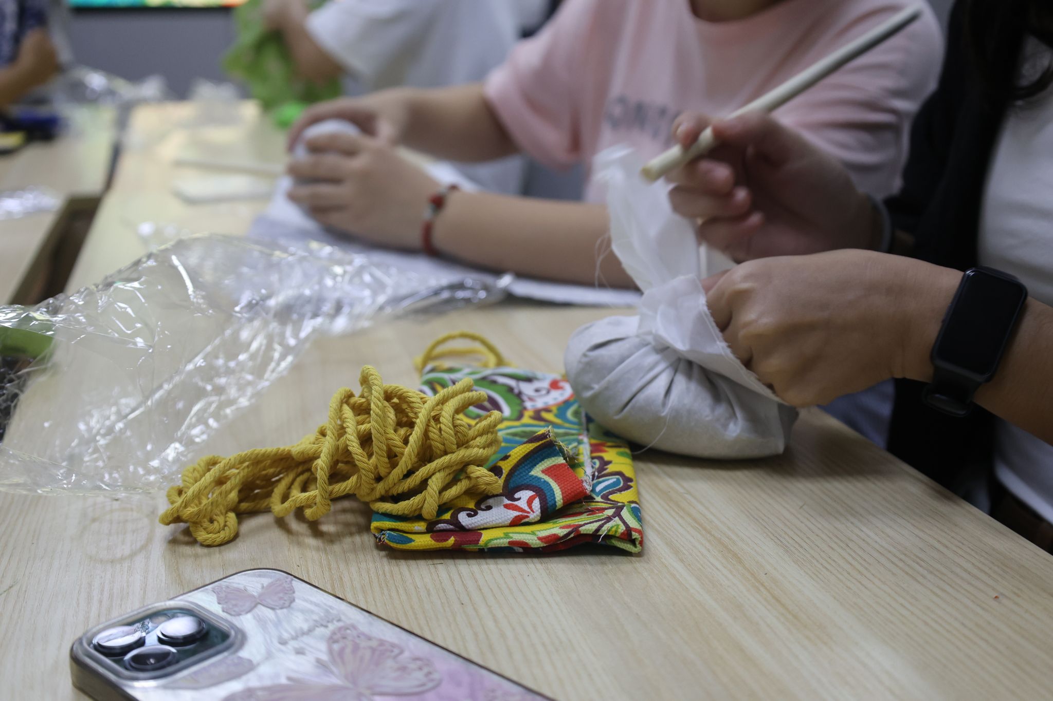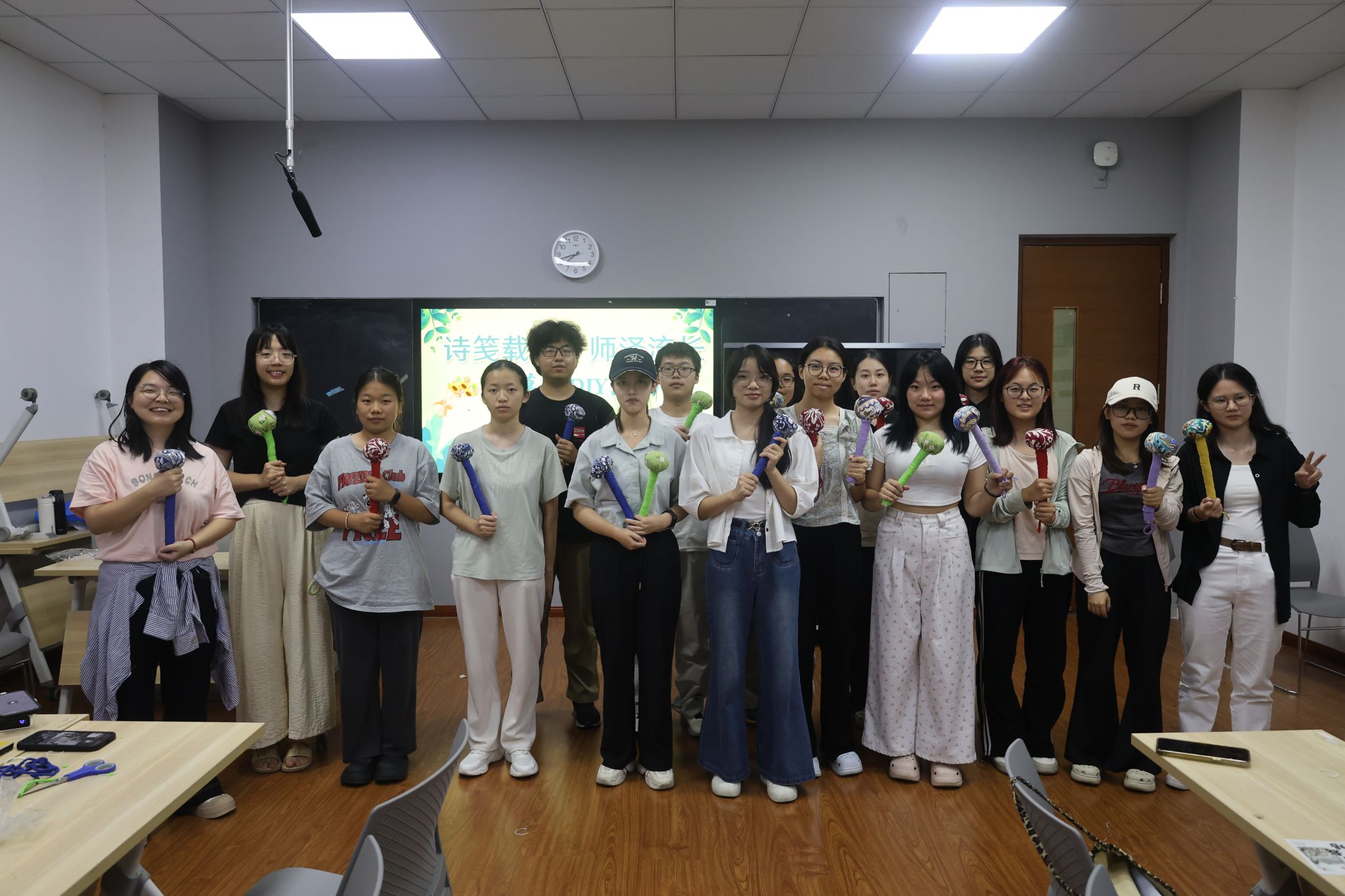 9月9日晚,“艾草锤DIY活动”在南湖综合楼N9006教室举行。活动以手工制作艾草锤为形式,让同学们在动手过程中表达感恩之意,传递师生温情。活动现场,清香弥漫,十余名同学围坐桌前,小心翼翼地将艾草和木柄填入棉布套中,双手轻拢布料,再用麻绳一圈圈仔细扎紧,动作间满是认真。大家不时交流包裹技巧,调整艾草松紧度,以古老的手作之礼,为恩师捶制一份秋日的温暖。