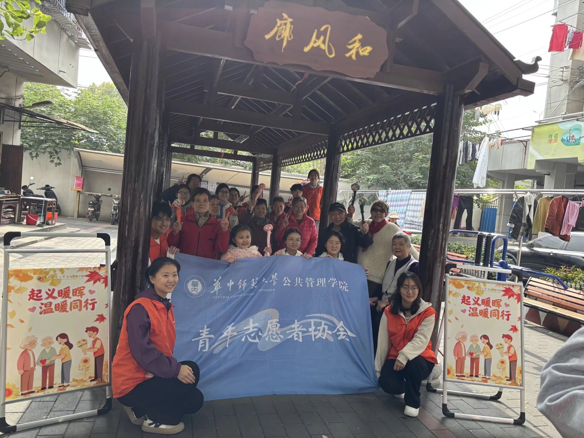 华大青年讯(通讯员 段啸)10月26日,为弘扬“奉献、友爱、互助、进步”的志愿精神,践行中华民族尊老、敬老、爱老、助老的传统美德,华中师范大学公共管理学院青年志愿者协会(以下简称“公管青协”)在武昌区明伦小区开展了以“起义暖晖”为主题的敬老志愿服务活动。