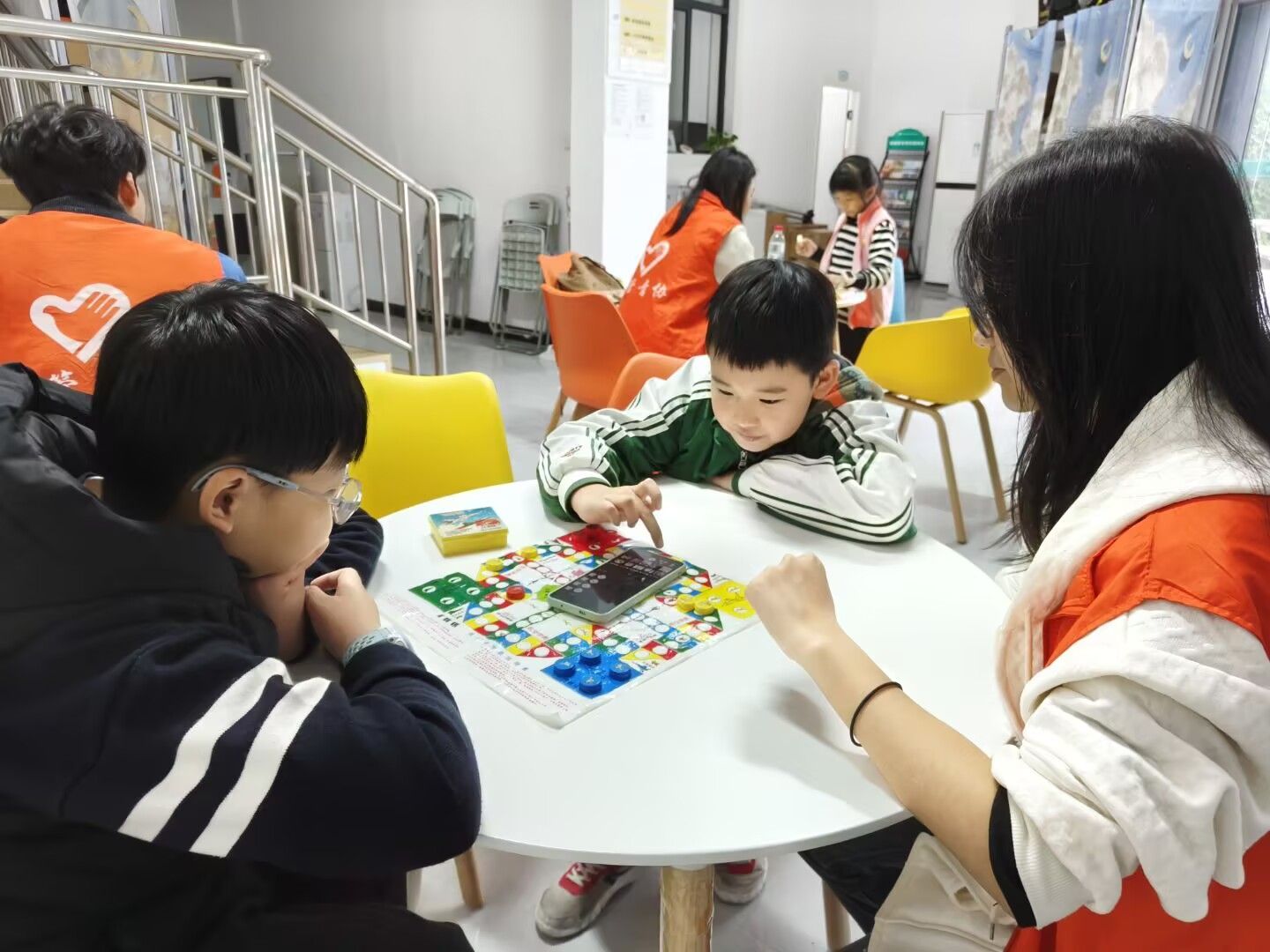 课业辅导结束后,志愿者带领孩子们前往一楼活动室开展棋类等游戏。活动中,志愿者全程“一对一”陪同,关注孩子们的安全,及时提醒他们远离危险物品。游戏互动不仅锻炼了小朋友的逻辑思维与耐心,也进一步拉近了他们与志愿者的距离,增进了彼此友谊。