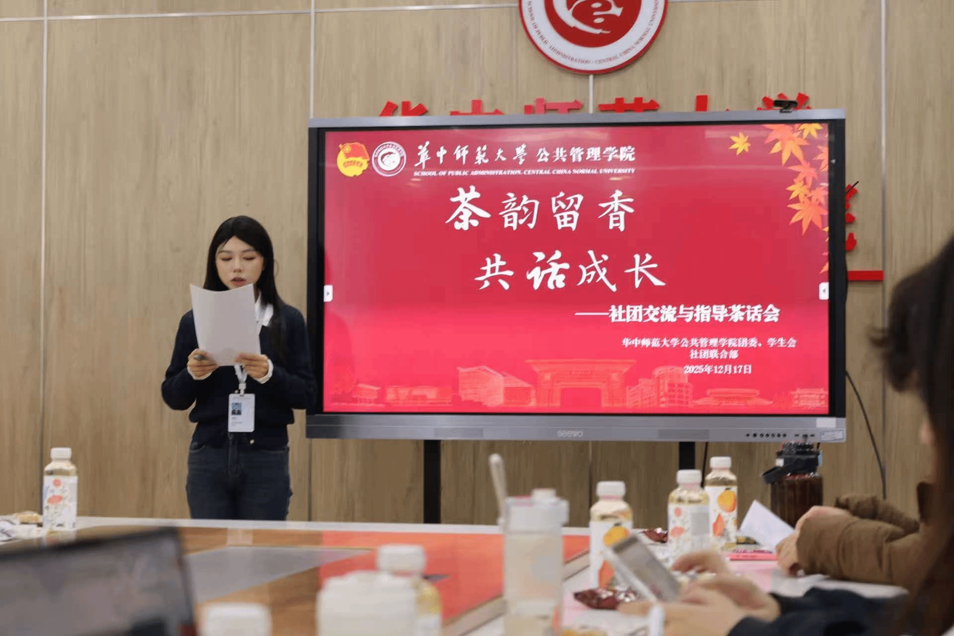 华大青年讯(通讯员 焦子轩 张莹)12月17日下午,公共管理学院“茶韵留香 共话成长”社团交流与指导茶话会在南湖综合楼9002教室举行。公共管理学院团委书记张子规,社团联合部全体成员,挂靠社团、辩论队负责人及其成员代表参加。茶话会由社团联合部部委金垚主持。