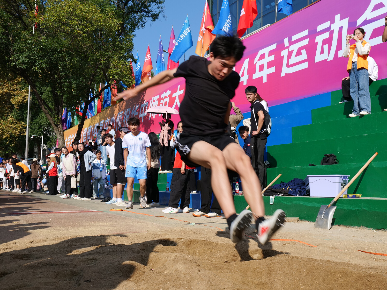 作为2023级学生,这已经是他第二次踏上这个充满激情与活力的赛场。在他看来,华师的运动会总是五彩斑斓、充满活力的。他回忆了两个印象深刻的瞬间:一个是50米接力跑开始前,化院20名选手聚成一个圈高呼“化院加油”的团结场景;另一个是跳远八人决赛时,不同学院的同学都在互相给“对手”加油,完美诠释了友谊第一、比赛第二的原则。这些瞬间让他感受到了运动会的魅力和体育精神的力量。