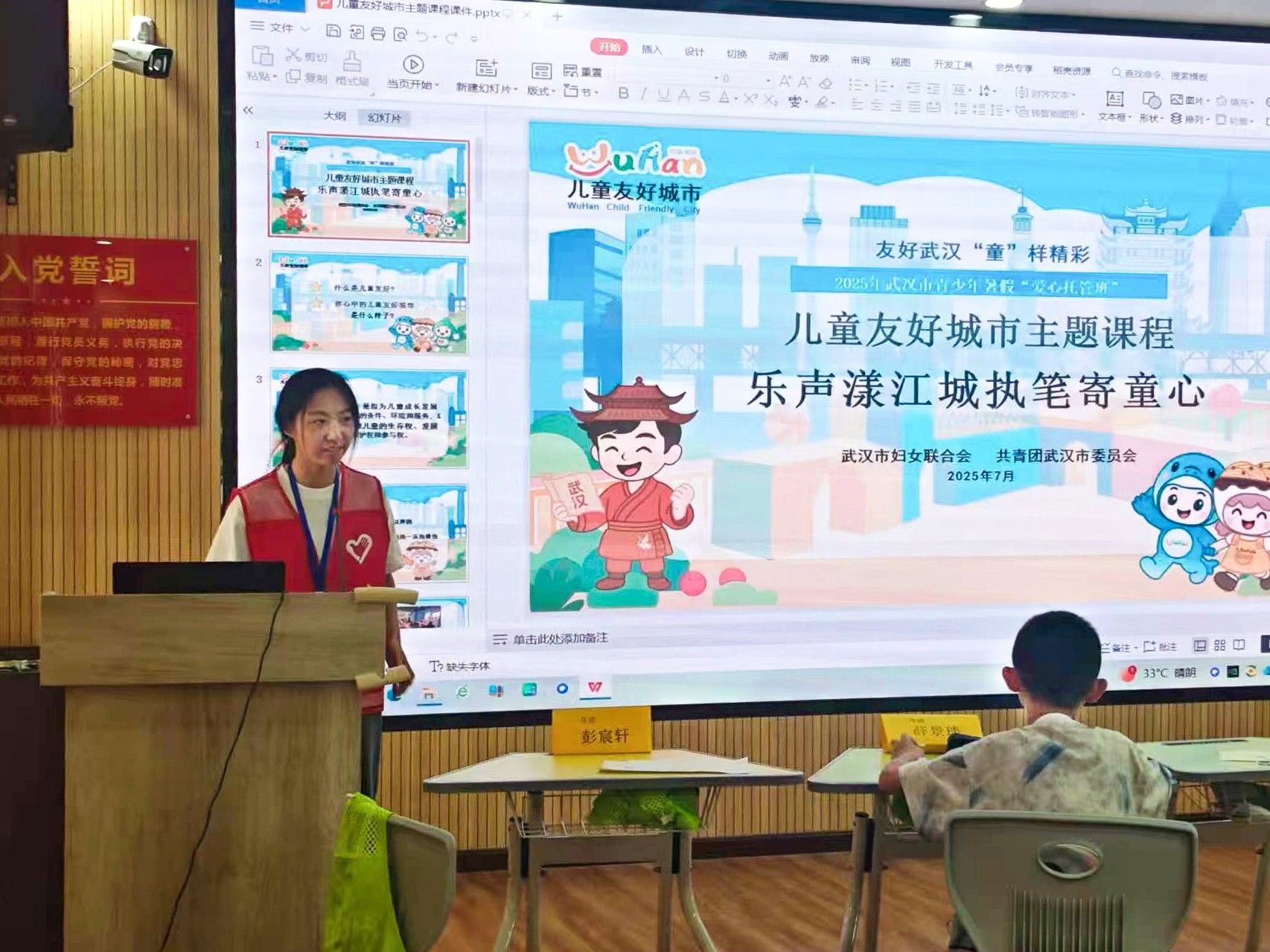7月15日,实践队胭脂路分队在胭脂路社区开展“声乐漾江城,执笔寄童心”儿童友好城市主题教育课程。队员任奕妃通过短片介绍了儿童友好城市标识元素的象征意义和四位可爱的吉祥物,再以趣味有奖问答带领同学们广泛了解城市为儿童打造的友好空间。最后,孩子们提笔写信,倾注对“儿童友好城市”的心愿与祝福。