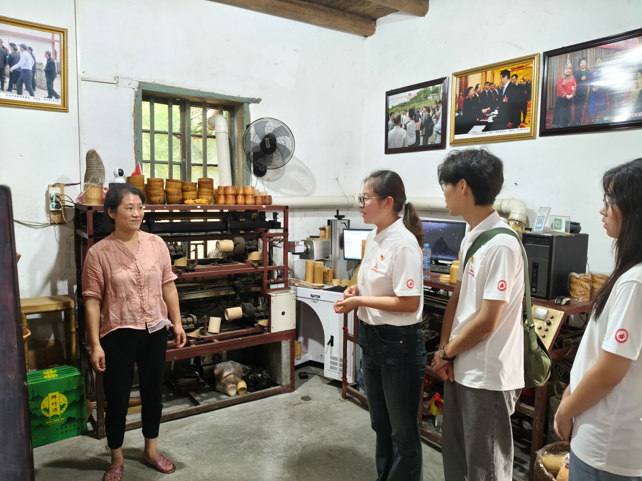 实践队首站抵达神山村,走访曾获习近平总书记2016年亲临视察的竹制品手工艺店。队员与店主深入交流,了解到店主兼具烈士后代、手工艺人、农民代表等多重身份,多年来坚守竹艺传承。队员现场参观各类竹制品,并模拟体验打糍粑,感受村落特色文化与手工艺传承魅力。
