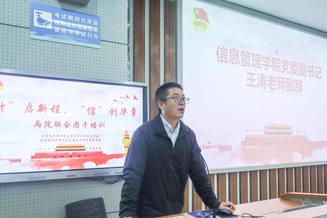 华大青年讯(通讯员 王玛茜 覃明凯 李心怡 蒋璋源 陈宇欣 陈雯潓 李逸飞)10月17日晚,计算机学院与信息管理学院联合举办的“‘计’启新程,‘信’创华章”团干培训开班典礼于南湖综合楼N107教室举行。计算机学院党委副书记庄甲鹏、信息管理学院党委副书记王涛、计算机学院团委书记肖克、信息管理学院团委书记王乐出席典礼,两院2025级全体学生骨干参加。典礼由信息管理学院团委组织部黄佳丽主持。