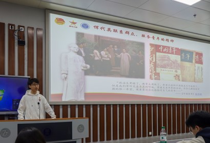 恽代英菁英学校第十期学员李逸飞以“以恽代英之名,共赴青春之约”为主题首先展开分享。他结合恽代英先生的生平事迹讲解了恽代英精神,随后过渡到对青马工程与恽代英菁英学校的介绍,最后基于自身政务实习感悟激励在场团学成员胸怀青春担当,努力成为对祖国有用的时代青年。