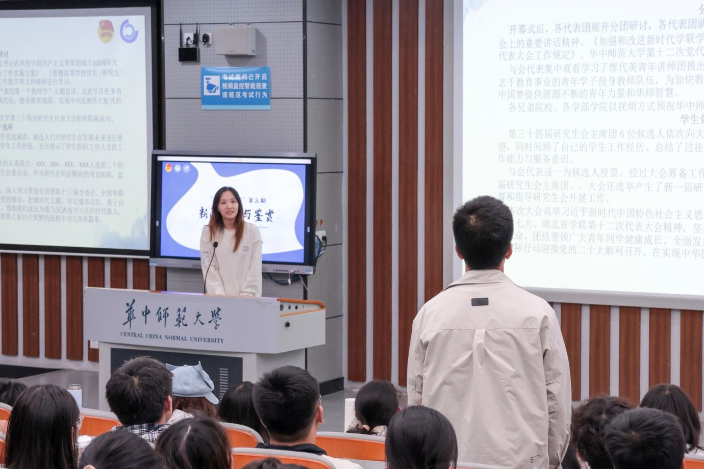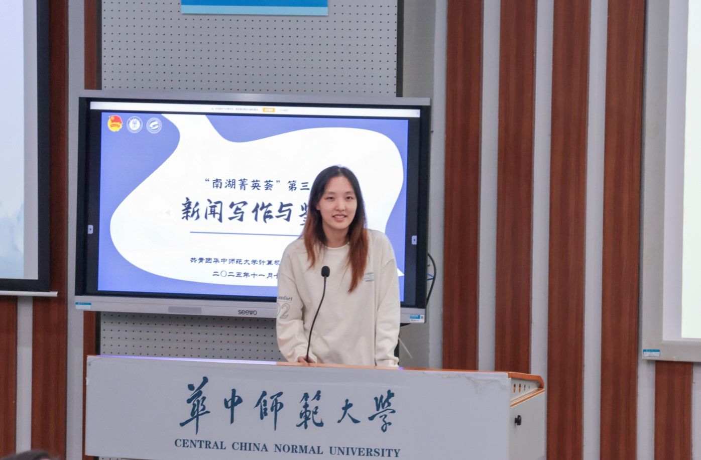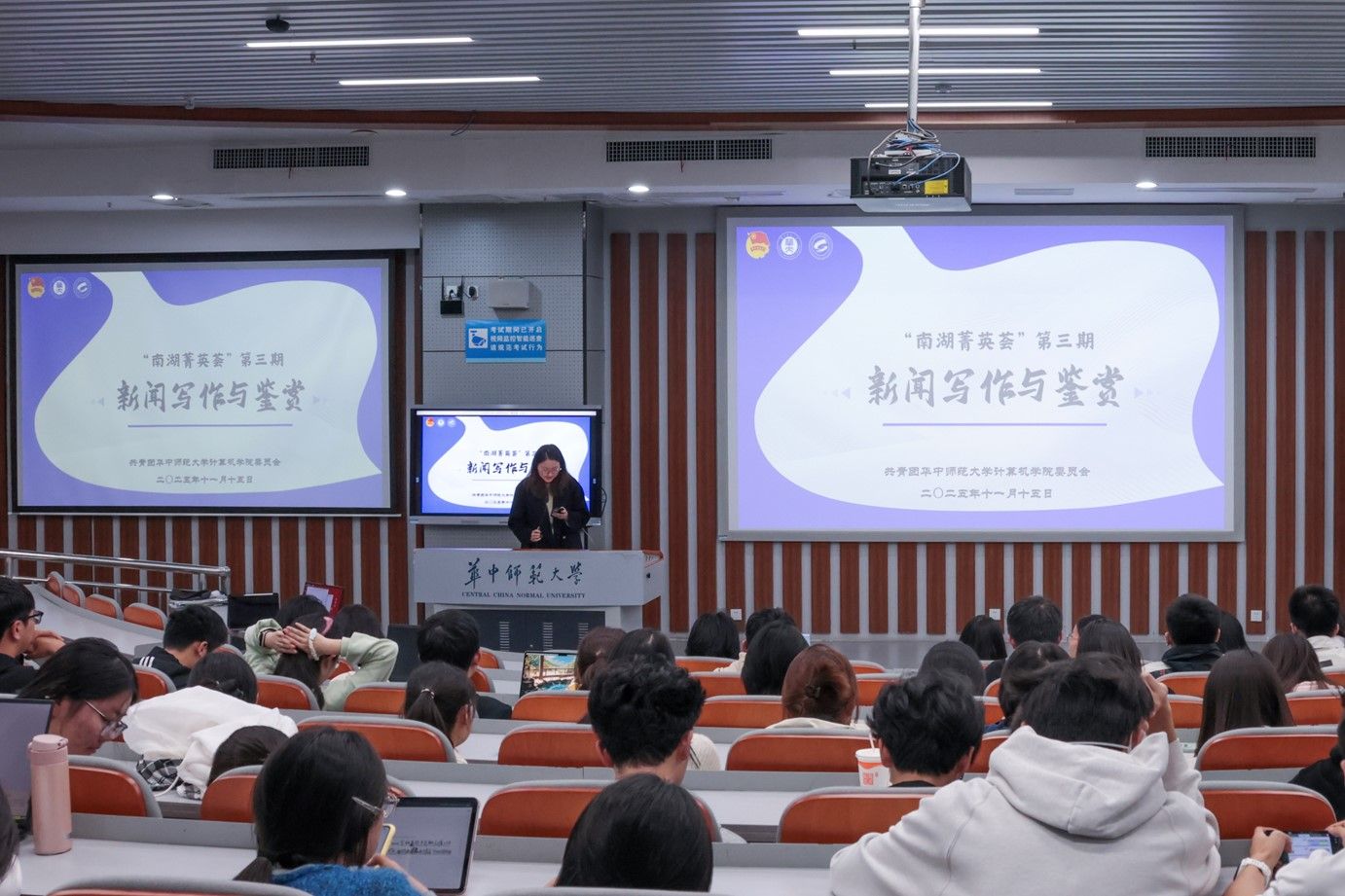 华大青年讯(通讯员 王梦琪 蒋璋源 陈宇欣 陈雯潓 李逸飞)为提升团学骨干新闻素养,11月15日晚,计算机学院“南湖菁英荟”第三期《新闻写作与鉴赏》培训在南湖综合楼N107教室举办。本次培训特邀华大青年融媒体中心文字采编部负责人肖舜草担任主讲人,计算机学院团委、第三十一届学生会全体成员参与学习。培训由计算机学院学生会主席团成员李佳乐主持。