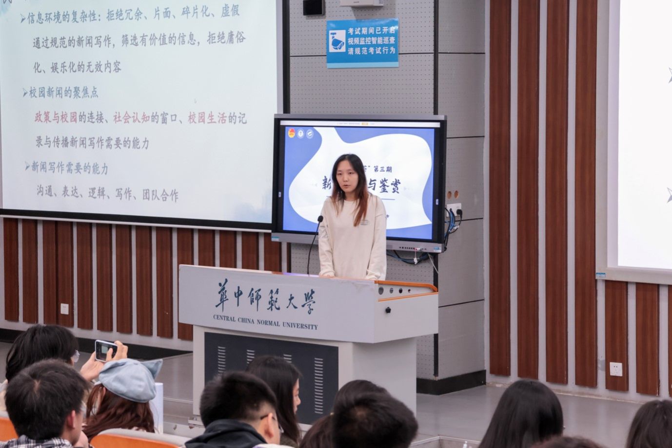 肖舜草首先从新闻基本定义切入,明确“新闻是对新近发生的事实的报道”,并重点强调了其时效性与真实性两大核心属性。结合当下复杂的信息环境,她指出,规范的新闻写作是筛选有效信息、抵制内容庸俗化的重要途径。针对校园新闻的特殊定位,她进一步提出三大关注重点:政策与校园的连接、社会认知的窗口以及校园生活的记录与传播,同时强调新闻工作者需具备逻辑、沟通、写作及团队合作等核心能力。