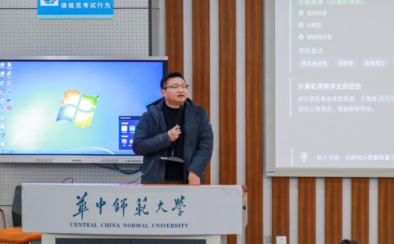 肖克结合自身指导经验,对学科竞赛进行了系统梳理。通过对比分析“大挑”“小挑”等主流赛事特点,他特别指出计算机学子在选题时应避免“大而全”的空泛构想,转而聚焦“小而精”的实际问题。随后,他从项目来源、团队组建、备赛方法、成果呈现等关键环节,分享了具体可行的备赛指导。最后,他鼓励同学们积极借助学院对科创赛事的支持体系,勇敢尝试、务实创新,“用代码解决真实问题,以实践带动能力成长”。