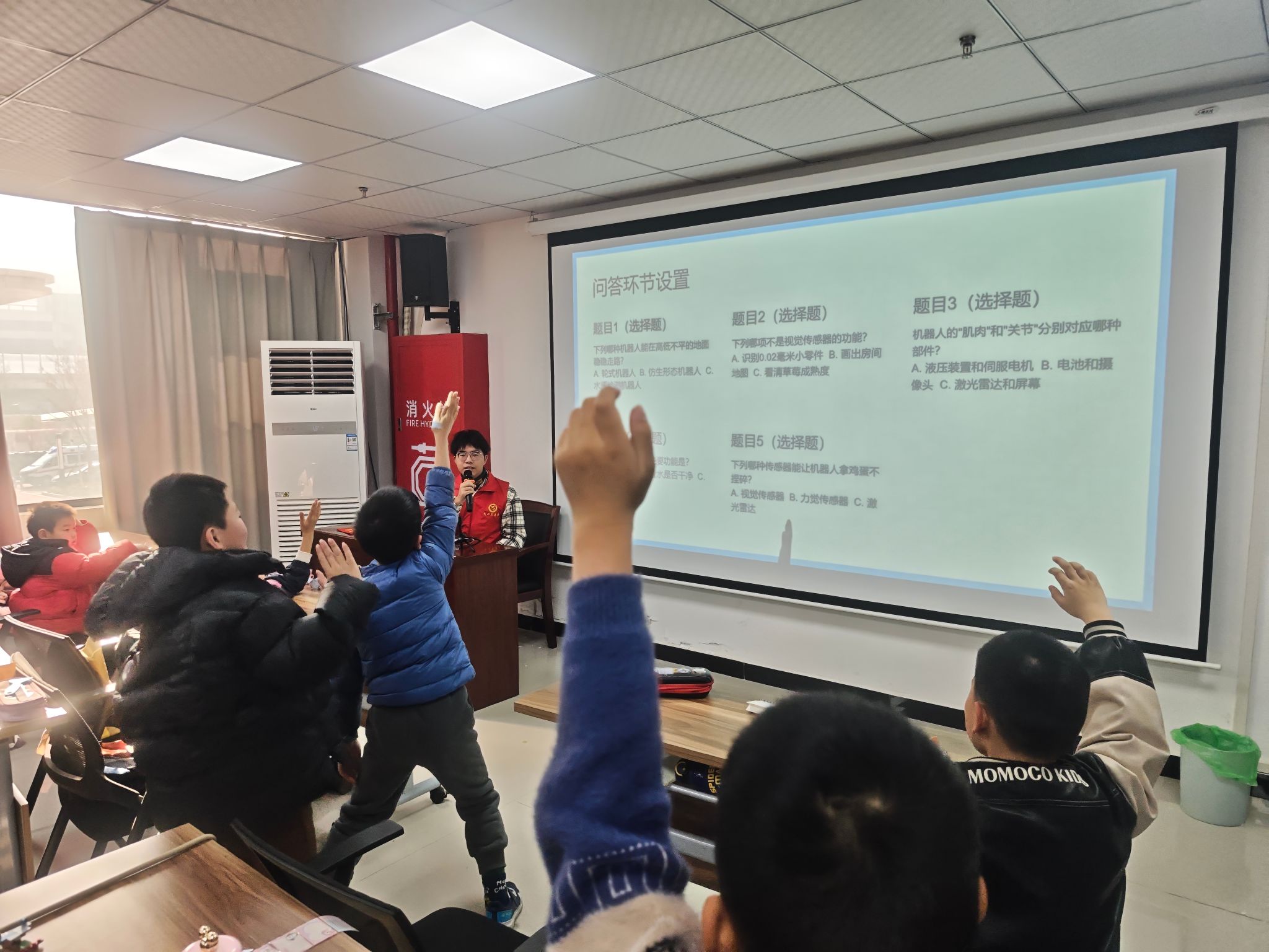 在洪山区中建三局青少年空间,课堂则洋溢着知识温度与跨界创意。志愿者李健坤发挥专业特长,将机器人原理转化为趣味科普,通过生活场景导入与互动问答,点燃孩子们的科技探索热情。
