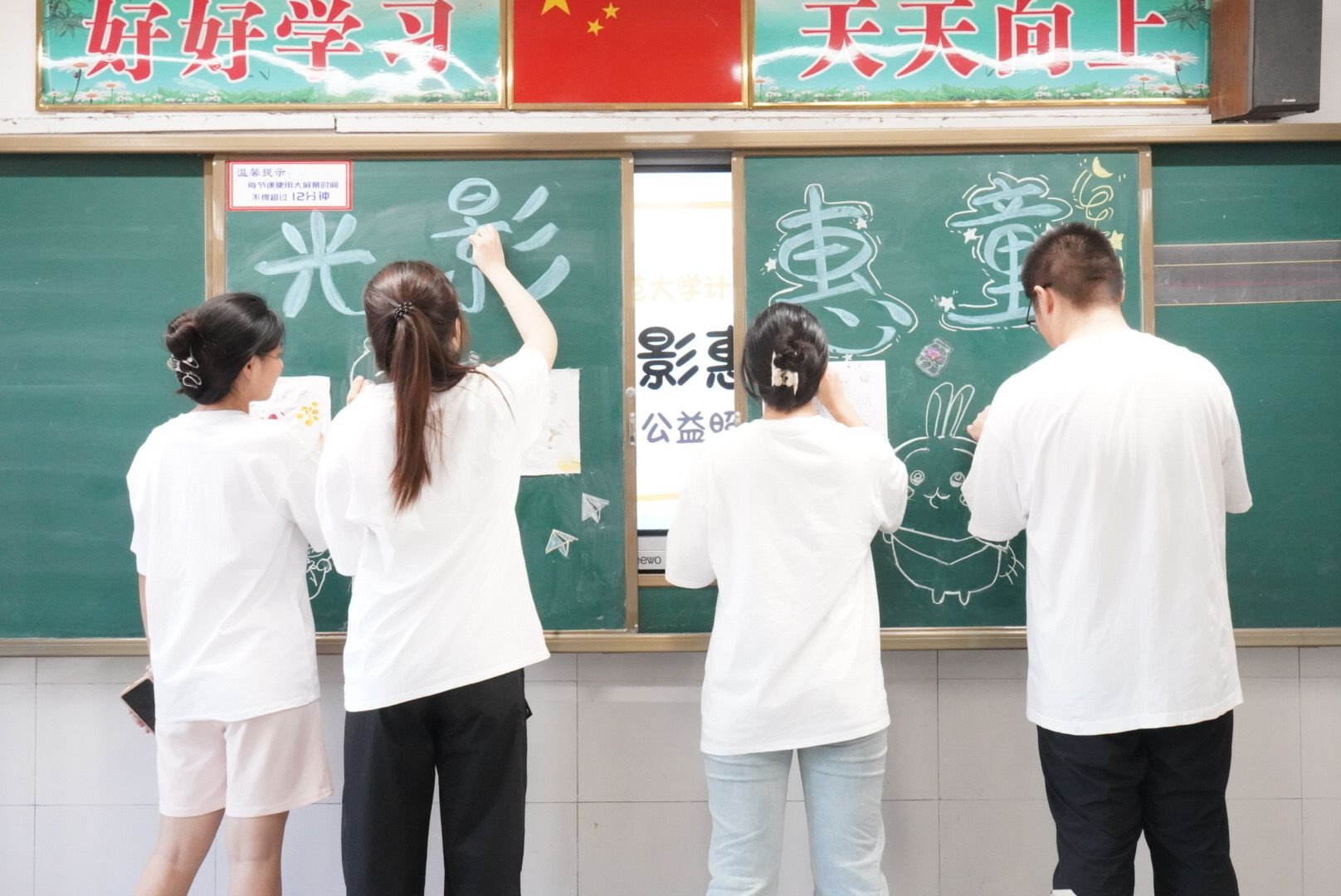 在活动筹备的关键阶段,实践队倾注巧思,打造了两块极具特色的背景板,一度成为现场的视觉焦点。其中一块由学生们亲手绘制的队旗拼接而成,每一笔色彩都流淌着童真童趣,每一片图案都绽放着奇思妙想,将孩子们的创造力与团队归属感完美融合;另一块则是实践队员亲手绘制的“光影惠童”主题黑板报,细腻的笔触勾勒出活动的温情内核,生动的图文阐释着公益行动的深层意义,让每一位观者都能直观感知到活动的初衷与价值。