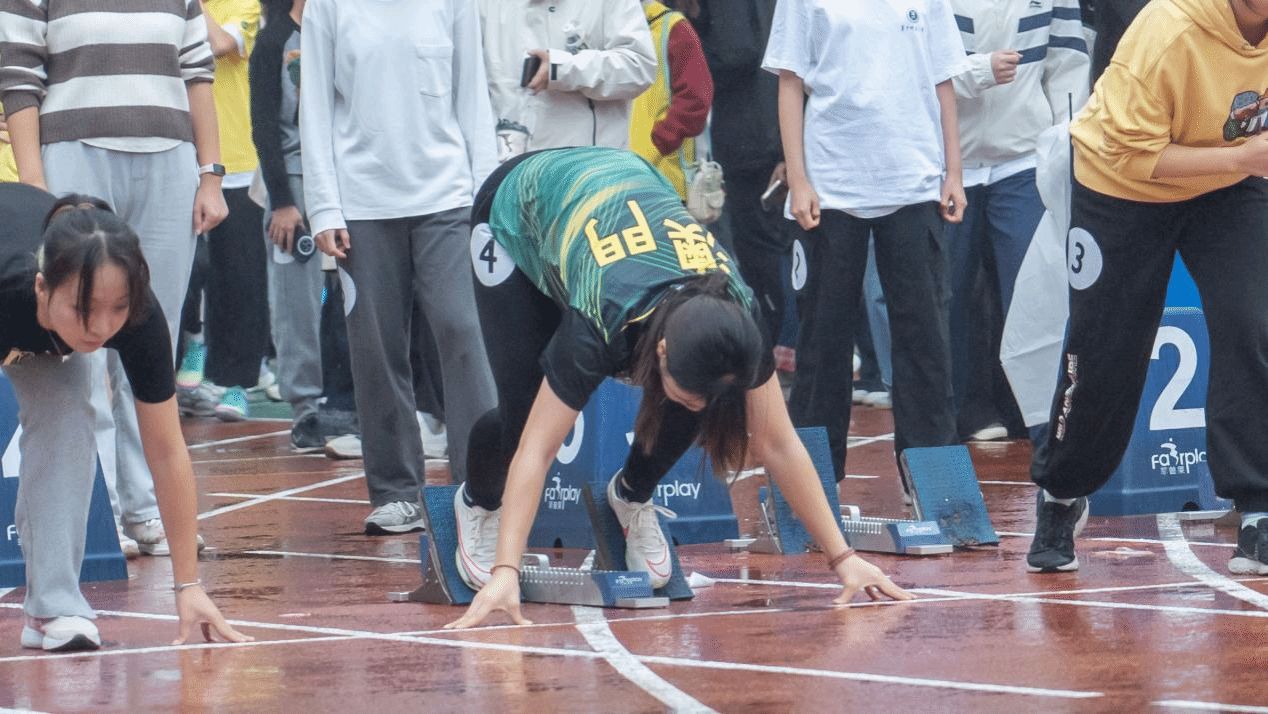 比赛当日,运动员们精神抖擞,在各自跑道上有序热身,蓄势待发。她们目光坚定,身体前倾,静待发令枪响。