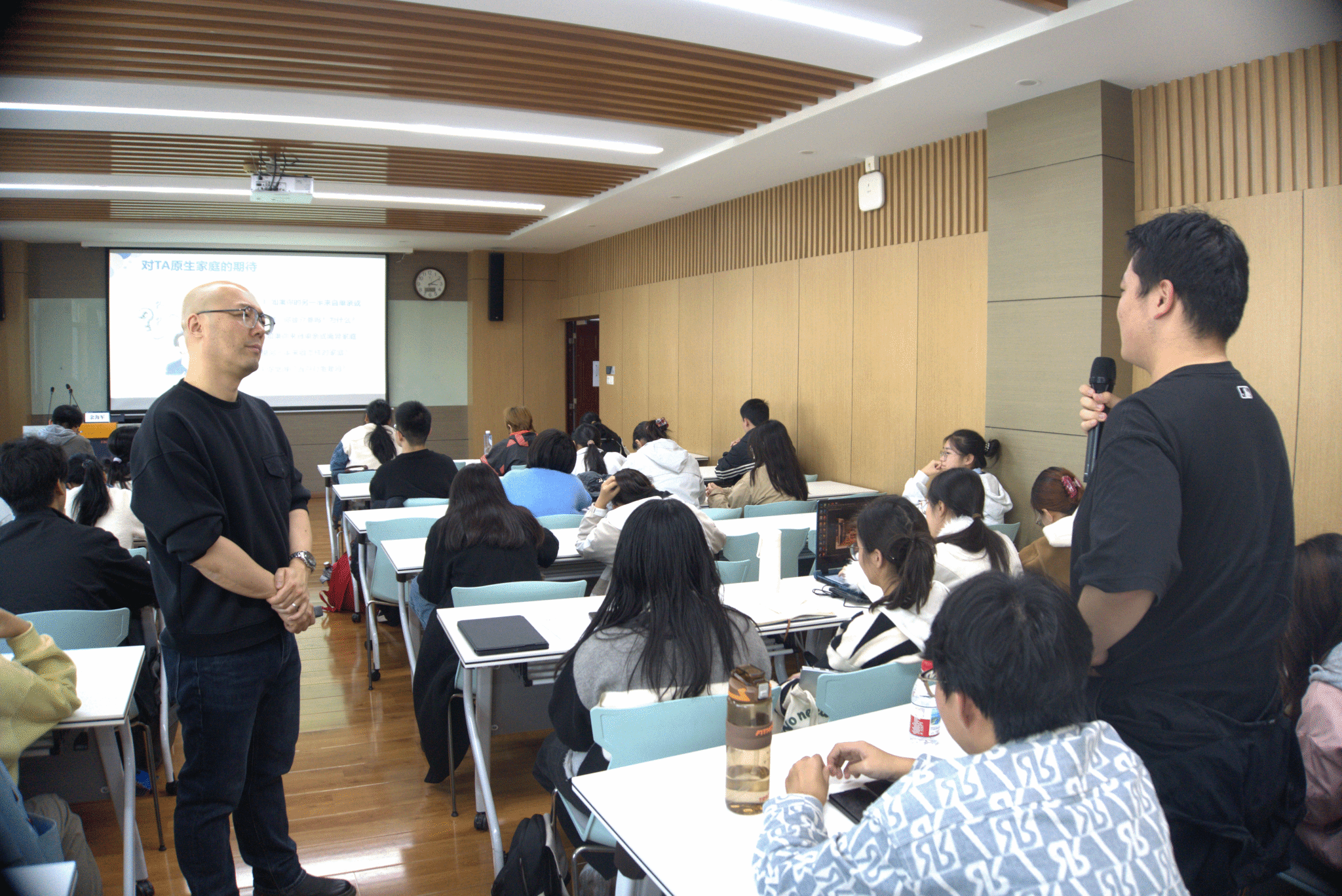 从理想回归现实,余海军老师抛出两个引人深思的问题:“如何看待关系”以及“你希望另一方家庭是怎样的?”同学们积极交流观点,现场气氛热烈。随后,余海军老师让同学们将自己与理想中的TA比作动物,以生动的方式凸显个性特点。余老师通过一段展示现实中不同恋爱认知的视频,引导同学们了解现实中他人对恋爱关系进程的认知。