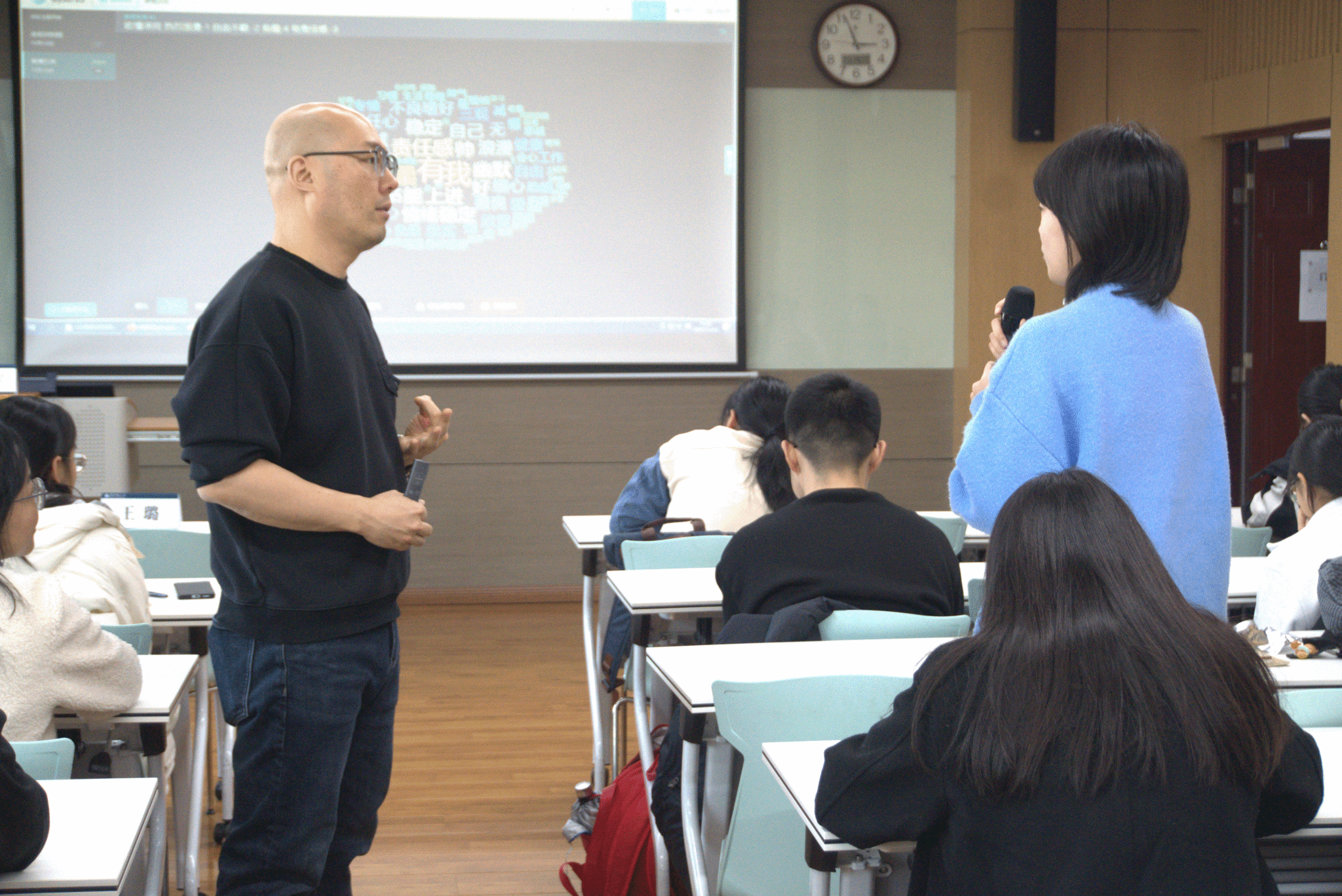 余海军老师从自身经历出发,引导同学们展开对另一半以及自我的思考。随后,同学们写下对未来恋爱对象和生活期待的关键词,同时余老师提供性格,能力等方面的关键词以供替换。通过替换、删减等方式,同学们逐步明晰理想中那个TA的形象。在提问交流环节,大家分享了这一过程中心理的变化,进一步探索了理想恋爱中TA的样貌。