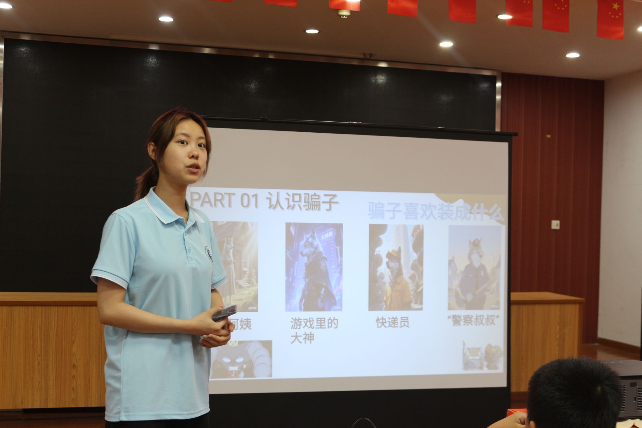法治教育聚焦校园安全痛点,为青少年安全成长保驾护航。在“未成年人保护法”讲解中,队员们以处理校园欺凌为例解析法条,帮助学生理解法律如何保障其权益,筑牢成长的法律防线。“青少年禁毒教育”课详细讲解各类毒品特征及危害,重点识别新型伪装毒品,传授防毒拒毒技巧。“防诈骗”课程通过模拟“冒充熟人借钱”、“虚假中奖”等情景,教授识破骗局、保护财产安全的方法,有效提升了学生的防诈意识与能力。课程构建“法律底线—生命教育—风险防范”三重屏障,为青少年成长保驾护航。
