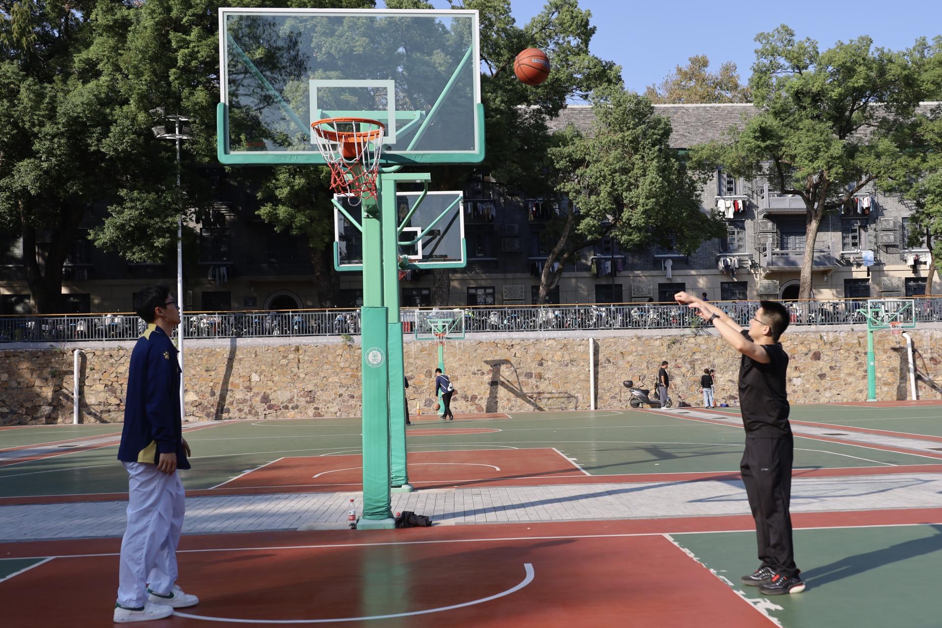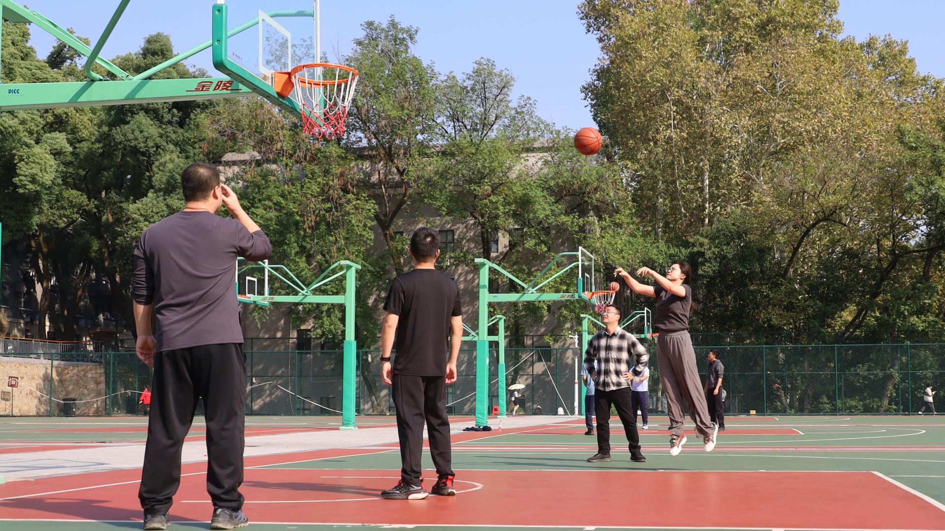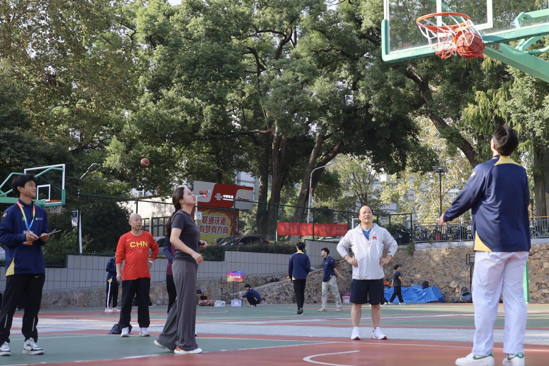 比赛开始前,教师们紧锣密鼓地进行投篮训练,通过练习保持手感,以期在比赛中获得佳绩。