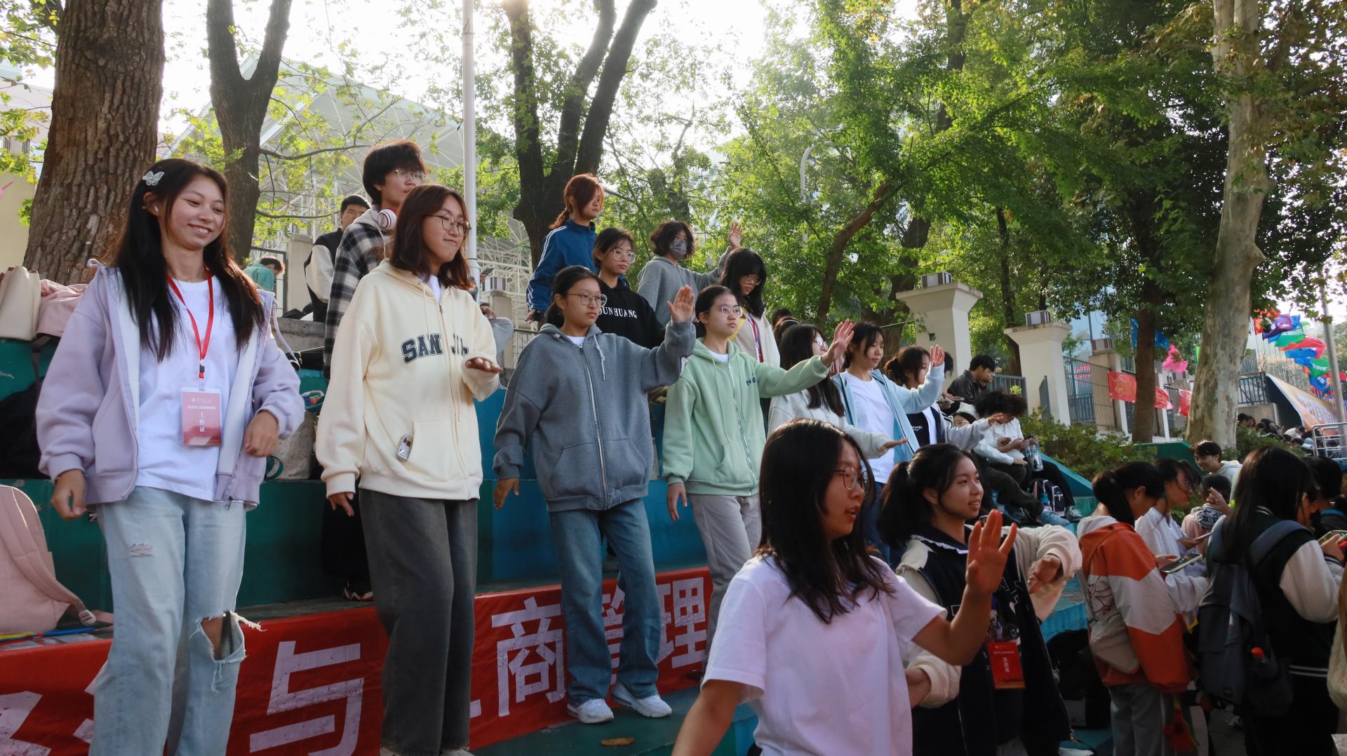 “向快乐出发,世界那么大,任风吹雨打梦总会到达……”跟随着欢快的音乐声,观众台上的同学们以欢快的集体舞展示,为校运会增添了一抹亮丽的风景线。经济与工商管理学院(下简称为经管学院)学子们的表演不仅展现了团体协作、奋发向上的精神面貌,更是学院自信热情的风采风貌的一次生动展示。