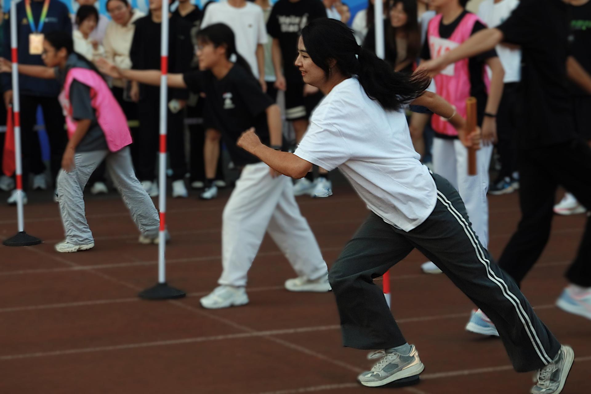 迎面接力,是速度与默契的较量。在迎面接力比赛中,经管学院的学子们同样展现出高超的竞技水平和凝心聚力的团队精神。赛前,他们认真练习交接棒的动作,尽量确保传接万无一失。随着发令枪响,第一位选手如离弦之箭般冲出起跑线,全力冲刺。交接棒时,队员们动作迅速而准确,每一次成功的交接都赢得了观众们的阵阵掌声。虽在起跑时暂时落后于对手,但队员们丝毫没有松懈、放弃,他们咬牙紧追。传棒,接棒,蓄力,腾飞......运动员们逐渐找回了状态,他们冲刺的步伐也越来越坚定,最终实现了局势的逆转。迎面接力,小小的接力棒传递的不仅是速度,更是团队的信任与凝聚力。