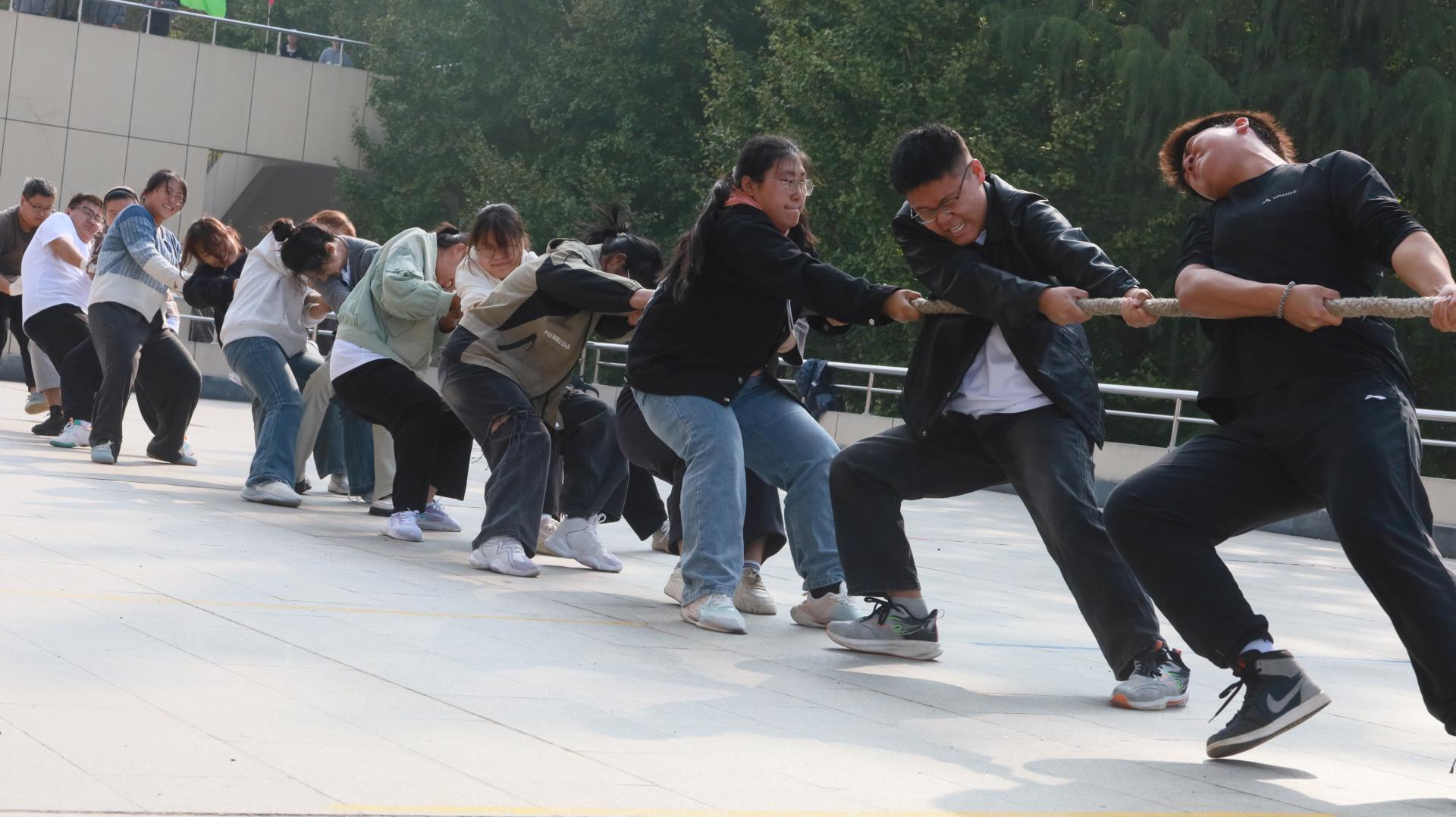 一声哨响,凝心聚力,寸土不让,只争毫厘。本次拔河比赛共有15名学生参赛。赛前,他们踊跃讨论战术,集思广益,积极探讨制胜之道。准备拔河时,队员们及时调整自己的姿势,心中默念“一、二、三”的口号,绷紧神经,双手紧紧握住绳子,仿佛要用昂扬的气势让对方动摇。