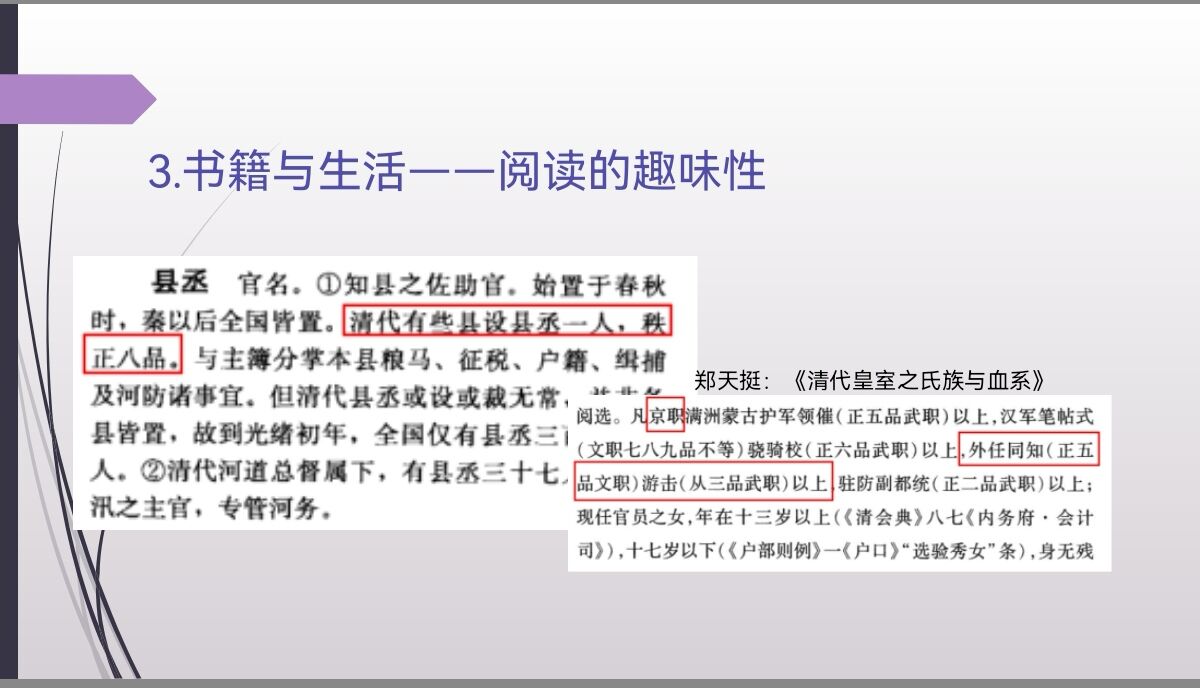 随后进行经验分享的是左雨舟,她的总学分绩排名位于专业第二,现已保研至中国人民大学历史学院。她的分享主要围绕两个方面:撰写优秀的读书报告和课程学习。她首先以高彦颐的《闺塾师》和福柯的《规训和惩罚》为例,阐释了读书报告中概括主要内容的方法,并解释了书籍在史学研究上的价值。左雨舟还认为书籍与生活其实是紧密联系的,每个人都能因此找到阅读的趣味性。