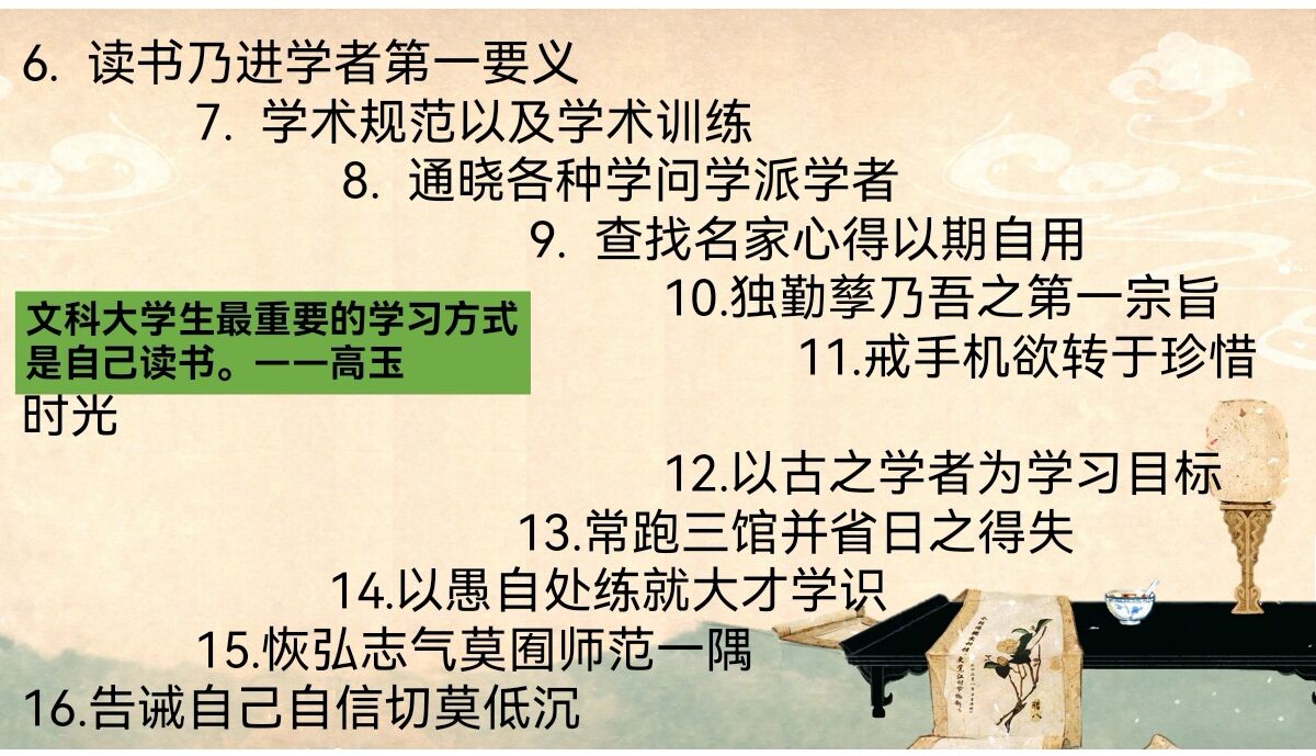 马晓曦他从自身的学习经历出发,为21级新生提出了20余条历史学习的方法,如学史料做辅助、学文献打基础等。在分享过程中,他借用高玉先生的一句话“文科大学生最重要的学习方式是自己读书”,着重强调了读书对于历史学习的重要性。