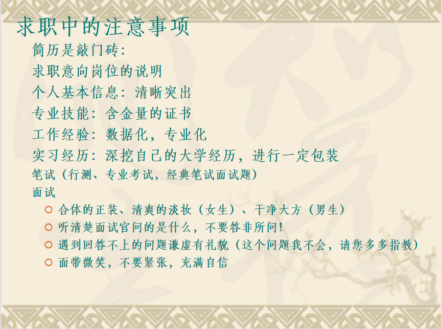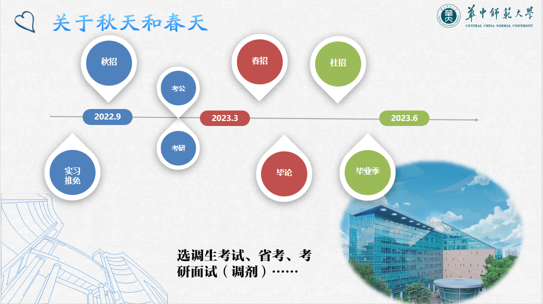 在师范生就业专场中,张志荣结合自己签约内蒙古包头市第九中学的经历,为同学们介绍从实习推免到秋招、春招,最后到毕业季的整个时间线。在分享了大量获取招聘信息的渠道后,她还介绍了招聘的基本流程。她以19级学子为例,告诉他们现阶段可以进行简历的制作和修改、自我介绍的准备等事项,同时也必须保持认真听课和读书的习惯。最后张志荣以自己的亲身经历讲述了准备几节好课的重要性,并告诉大家要储备扎实的专业知识、不断提高师范技能。
