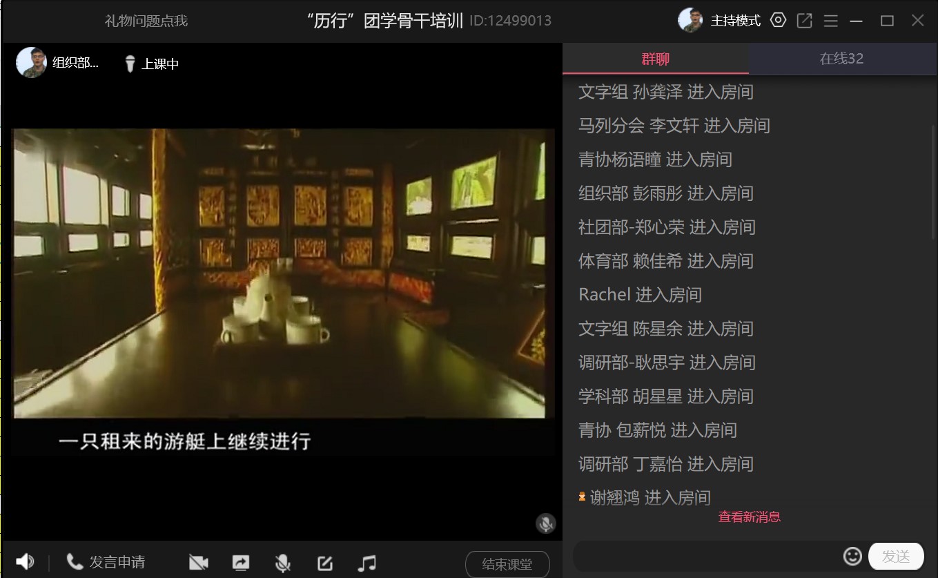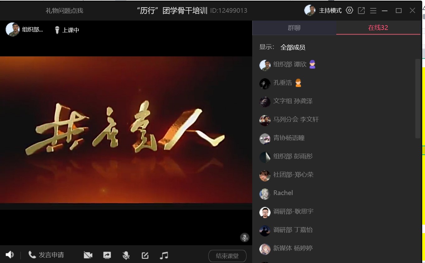 华大青年讯(通讯员 陈星余)8月5日晚,历史文化学院(以下简称“历院”)2021年“历行”团学骨干训练营一期培训第一次课程于腾讯群课堂举行。活动由历院团委组织部主办,面向2021届团委学生会新任部门负责人,并将“党史教育”融入培训内容,切实做到学史明理、学史增信、学史崇德、学史力行,学党史、悟思想、办实事、开新局。本次课程由团委副书记孔垂浩主持,以“以史为鉴,经世致用”为主题,通过观看党史纪录片,让团学骨干切实感受波澜壮阔的百年历程,历久弥坚的百年初心。