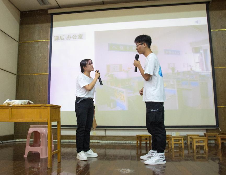 在王欣宇、吾都玛简要介绍了活动目的及规则后,本次活动正式开始。首先登场的是2004班,主讲人刘萍从师风师德建设、班级活动开展、师范能力建设、总结反思等几个方面展示了2004班的班级风貌。随后,2004班的同学上演了小品《成为一名教师》,节目直击当代教师职业的痛点,点明了教师在协调家庭与学校关系的困难之处。除此之外,节目也指出学生家长、网络舆论、上级领导都是当代教师压力的种种来源,但是在重重的压力之下,教师依旧要不忘初心,坚守在岗位上,就如节目中的李老师一样,在坚守自我、度过风雨后获得了所有人的尊重。