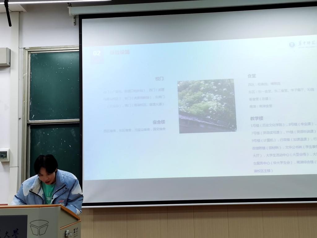 大会的第二部分,由王海杰来介绍校园的基础设施及服务。除介绍了校门、宿舍楼、食堂、教学楼等校内地点之外,他还对华师周围丰富的景点和娱乐场所进行了简单罗列,建议学生在课余时间进行游玩。针对学生不清楚上课地点的问题,王海杰对各个课程的常见场地进行了简单的介绍,为学生展示了一份详细的指南,专门说明了各种字母的意义和各种体育课的上课场地。最后,他还介绍了学生在生活和学习中经常需要使用的校园服务。比如最重要的华师匣子APP、和线上素质课程密切相关的华大桂声、与校园卡充值有关的CCNU校园卡与ITS中心等。
