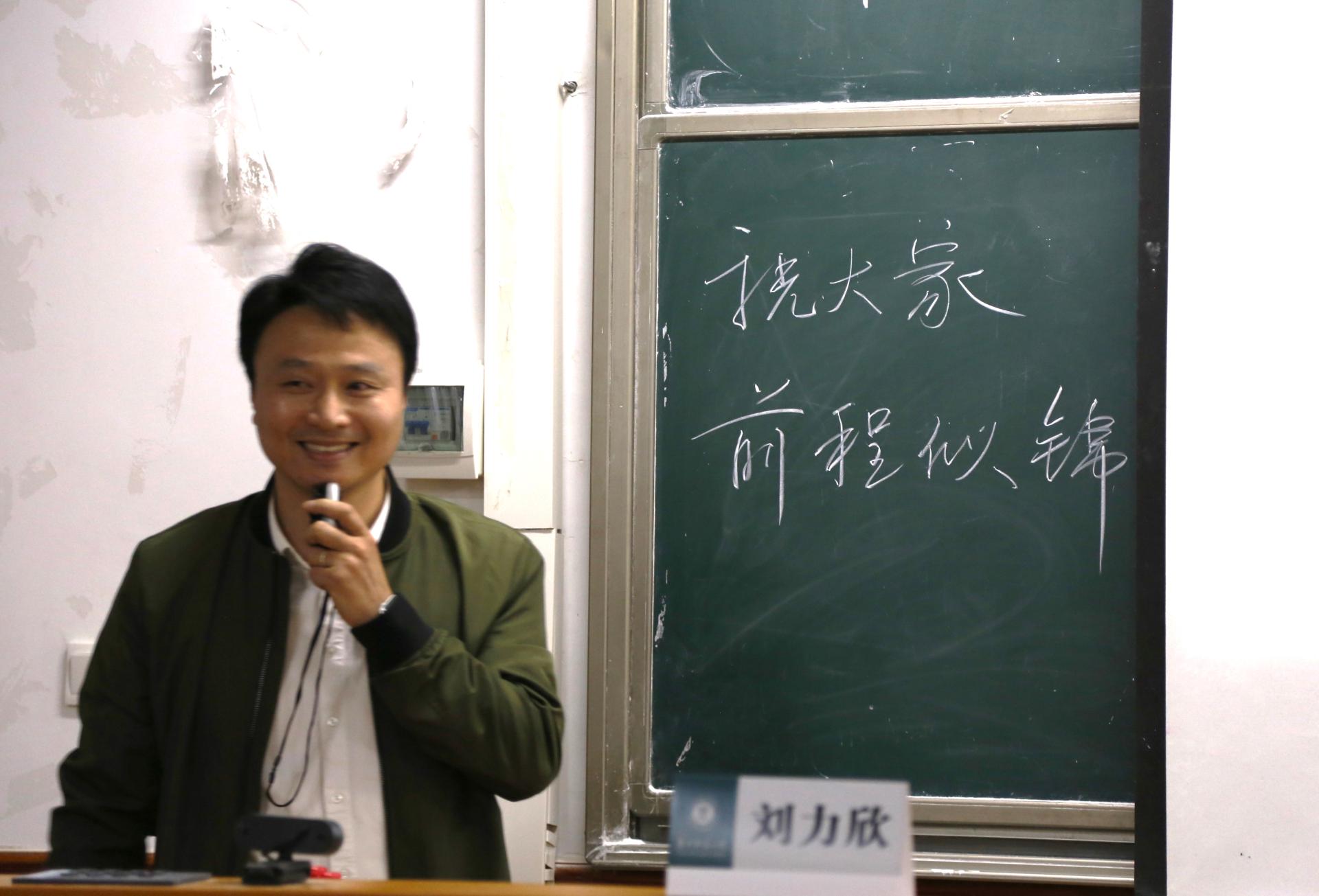 刘力欣还强调了板书设计的重要性,他指出在信息技术应用广泛的时代大背景下,师范生依旧需要重视板书设计在说课中的分量。因此师范生平时板书练习要从精简和速度两个维度入手,逐渐形成自己的板书风格。他以当晚的讲座“说说‘说课’”进行现场说课,为大家总结说课的基本流程在最后的板书环节,他转身书写“祝大家前程似锦”的粉笔字为本次讲座拉下了帷幕。