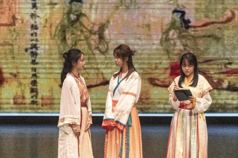 历院2204班结合历史专业特色,秉持师范育人本质,以东晋画家顾恺之的名作《女史箴图》为线索带来风采展示。他们通过人物服装、神态的高度还原,展示出画卷中女官眷妾的优雅风韵,挖掘了文物蕴含的传统艺术魅力;通过英国军官偷盗《女史箴图》的情景演绎,讲述了这一文物瑰宝被掠夺破坏、流失海外的悲惨历史,引发观众共鸣;最后将立意上升到文物流失问题,传达了历史师范生要帮助学生树立文化自信、赓续文脉薪火的新时代使命担当。整个节目以课堂教学的形式呈现,结合插叙的讲述方式,寓意新老教师相继承担育人职责,彰显师范立德特色、教师奉献精神。