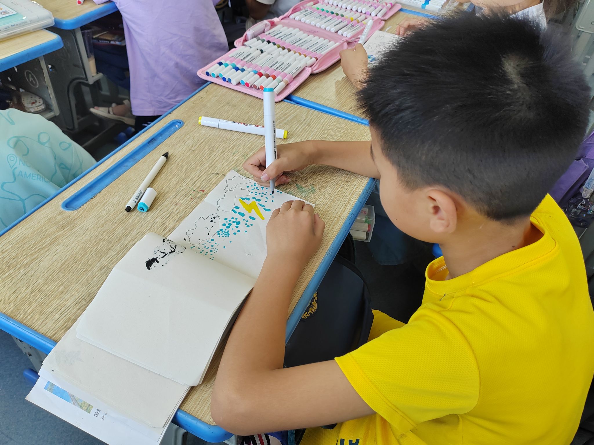 开始创作之前,谭雪迎强调了使用丙烯颜料的注意事项,如避免接触口鼻、少量取色等。在原理学习的基础上,孩子们在绘画本上开始创作。他们充分发挥想象,用深浅不同的灰色表现乌云的厚重,用线条勾勒雨滴,用亮色点缀闪电。有的作品着重展现乌云密布的天空,有的则描绘雨落大地的场景,每一幅画都充满童真与创意。
