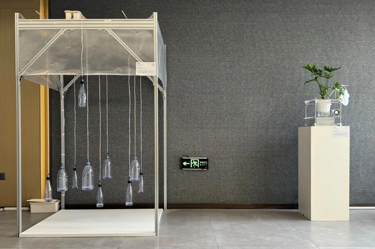 《悬序》以光影与水介质为核心机制,3×3点阵悬挂的矿泉水瓶形成秩序化结构,观众敲击触发震动,瓶底纹路经折射投射为地面流动光斑,使日常容器在动态变化中获得“治愈式”的新生。《脉息》则以植物叶片的微弱电信号为驱动源,控制气囊的鼓起与回落并联动声场变化,观众的靠近与呼吸会触发非线性律动,使叶片波动被转译为可感的“呼吸节律”,从而揭示技术对生命感知的渗透与边界。