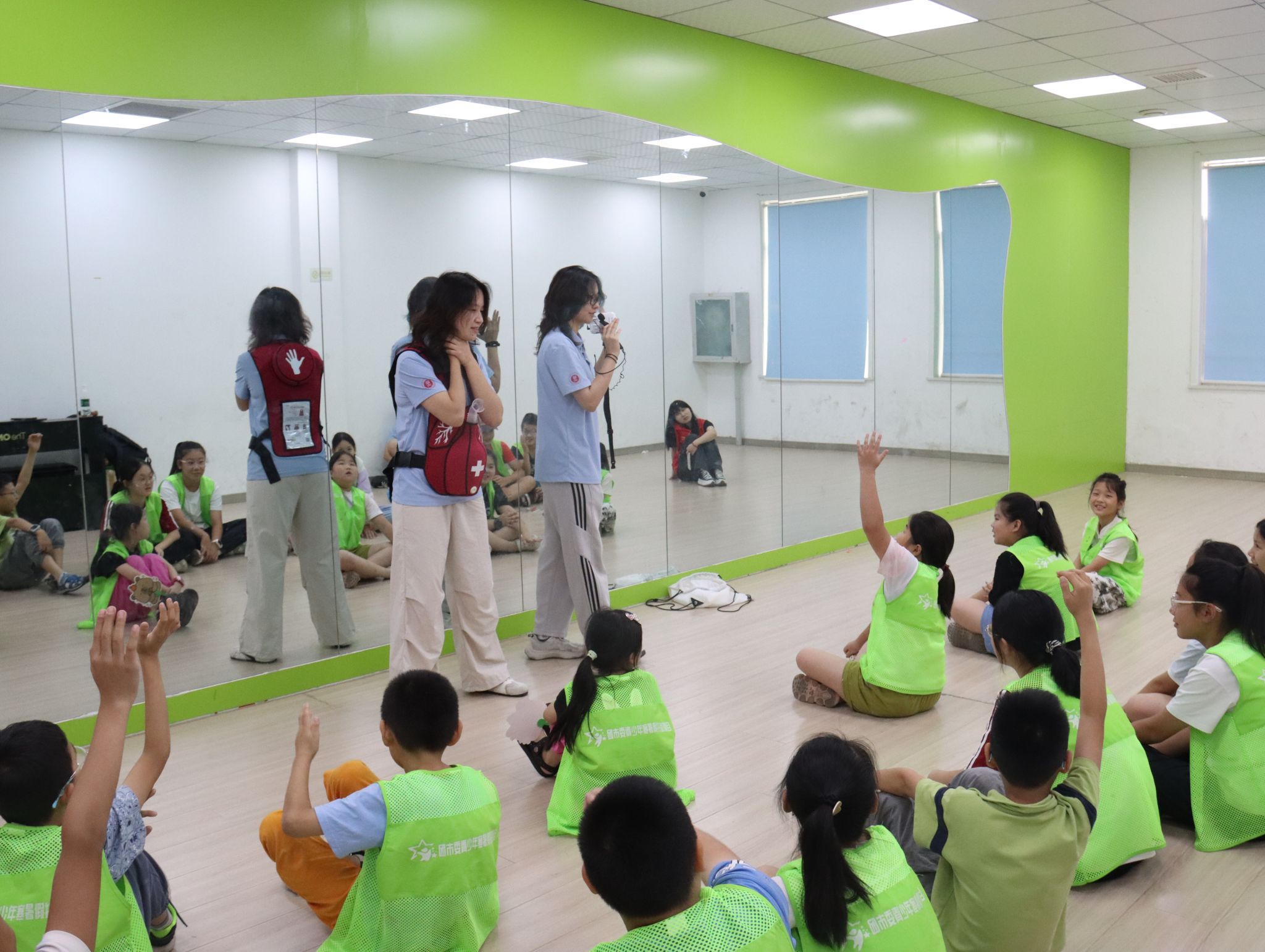 在“克险救急”环节中,实践队员李雪薇以“憋气挑战”引导学生体验气道异物梗阻的紧急状况,深刻理解"黄金4分钟"急救时间的重要性。随后,她将“腹部冲击法”编排为“剪刀、石头、布”口诀,配合特制急救训练背心讲解,帮助学生快速掌握动作要领。在实操环节,孩子们分角色体验“施救者”与“被救者”,在互动中掌握急救方法,完成从“知识”到“行动”的转化。