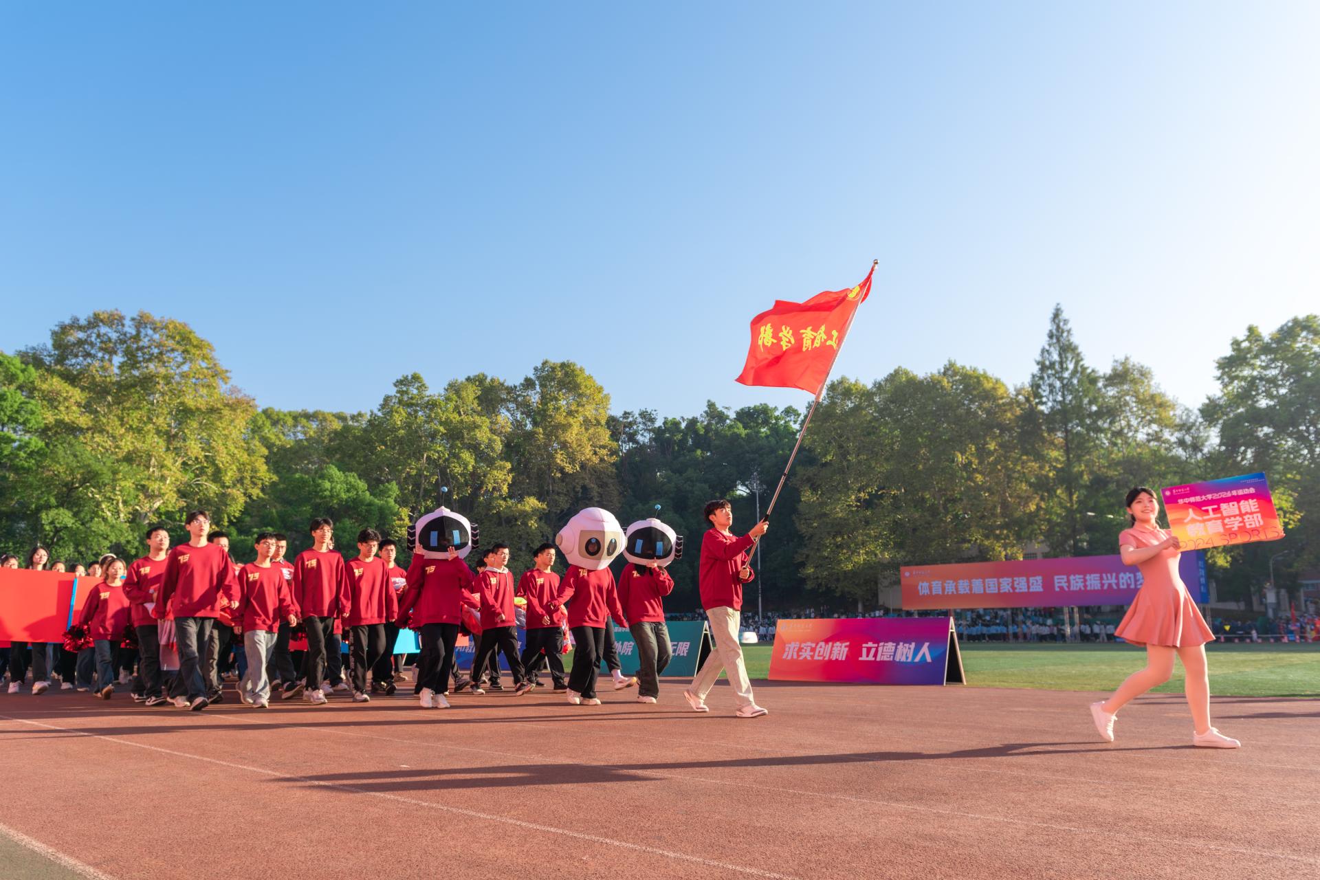 华大青年讯(通讯员 吴莹莹 余佳颖)金秋十月,丹桂飘香。10月31日,华中师范大学2024年运动会在佑铭操场隆重开幕,人工智能教育学部(以下简称“学部”)150余名学生和教师组成学部代表方阵参与开幕式,60名运动员、46名志愿者参与赛事。