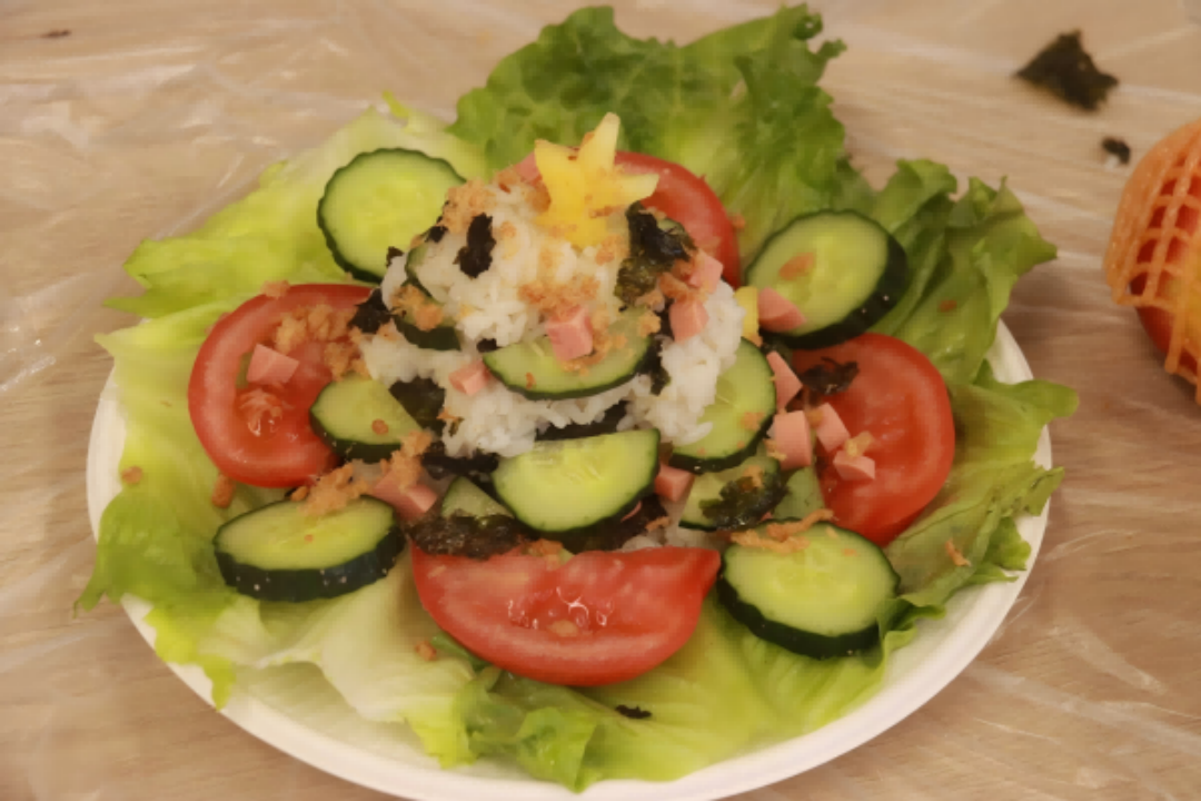 “美食造型大比拼”环节以“三减三健,营养先行”为主题,旨在引导参与者通过美食造型创作,直观地展示如何在日常饮食中落实“三减三健”这一理念,践行国家倡导的健康生活方式。现场,各组用全麦面包、鸡胸肉等低盐少油食材,设计出清新田园三减餐等创意作品,让同学们更好认识到“减盐”“减油”“减糖”以促进身体健康发展的理念,助力提升学生健康素养。