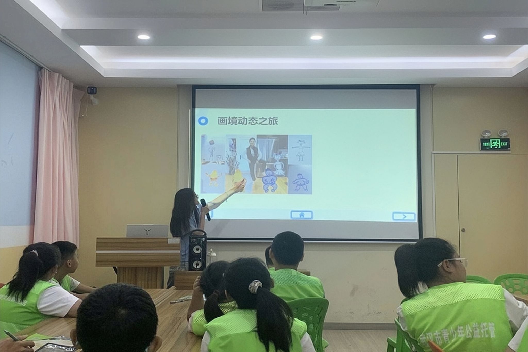 在 “动态画境之旅” 环节,实践队员白悦采用了"理论讲解-示范演示-自主创作"的三段式教学方法。她以“人工智能赋能创作”为核心,向同学们讲解了静态画作的动态转化方法及其在数字艺术领域的实际应用,并组织大家动手创作画作。随后,白悦运用人工智能技术让学生们的静态作品变为动态视频,使同学们切实感受到人工智能的工作原理及其在美术创作领域的应用价值。