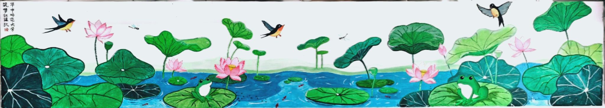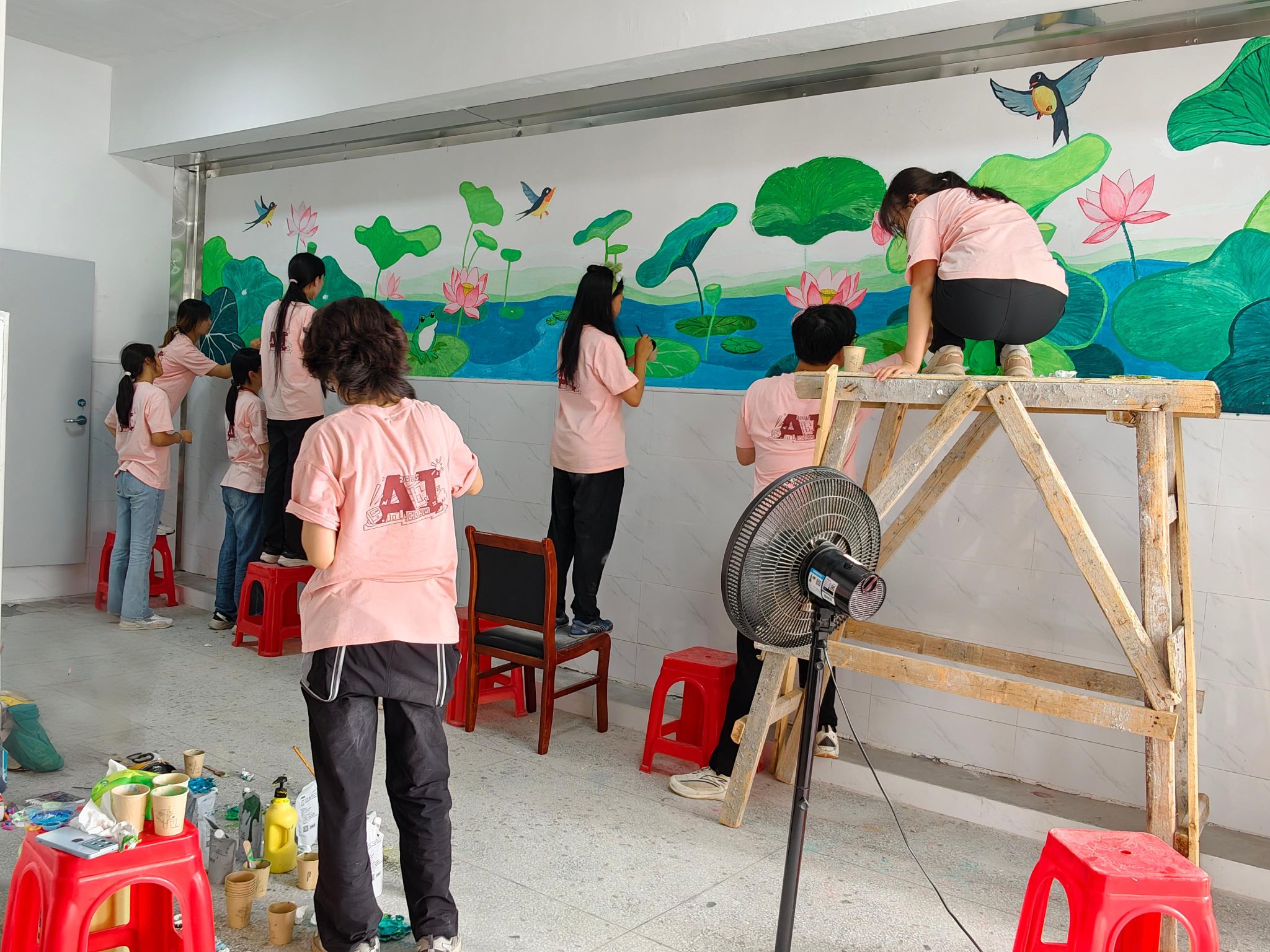 从前期与校方“共商方案”,到现场“同绘画卷”,队员们始终践行“一起想、一起谈、一起画”的理念。数字媒体专业同学勾勒图形轮廓,教育技术学专业同学调配色彩明度,充分考虑特殊儿童的认知接受度,打造温暖、生动的视觉空间。从鸟语花香到青蛙蜻蜓,从碧绿荷叶到粉白花瓣,每一笔都凝聚着他们的专业功底与真情投入。