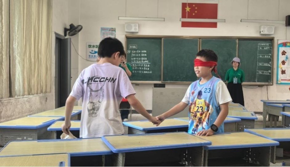 “视力障碍站”和“肢体障碍站”重在让同学们感受残障人士生活的不便,启发他们帮助不同人群打破障碍,融入社会生活。一位同学蒙上眼睛,在另一位同学的指引帮助下拿到物品并到达终点,再由一位同学用非惯用手将平铺的衣服叠好。同学们成对协作,顺利完成了比赛。