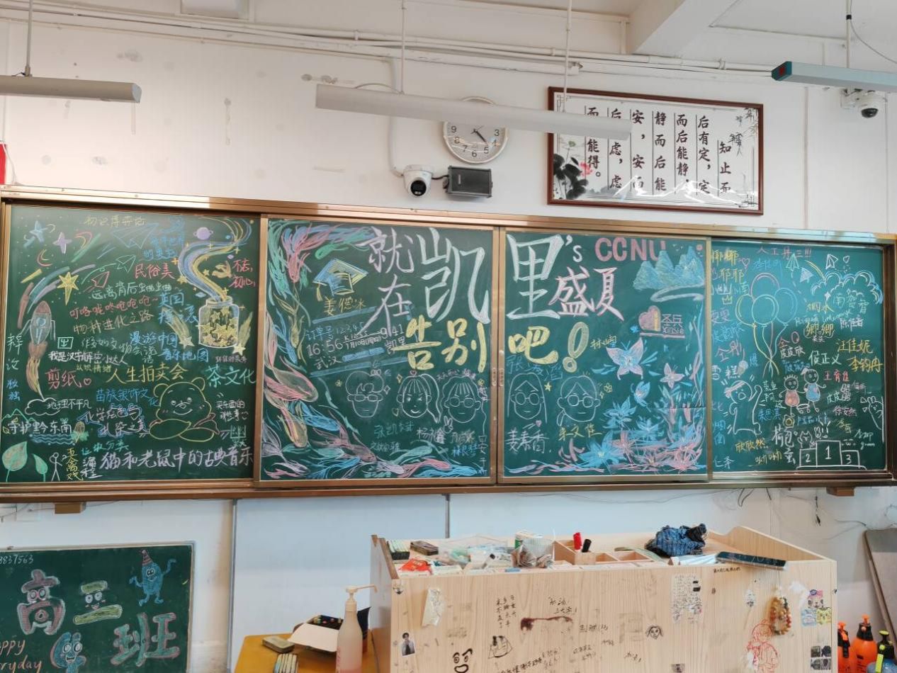 结营仪式开始前,凯里队授课组的成员们相约在教室。他们把教室前方的黑板视作承载情感的画布,精心绘制了以“就在凯里盛夏告别吧!”为主题的告别板报,温暖丰富的图片与色彩烘托出依依惜别的氛围。