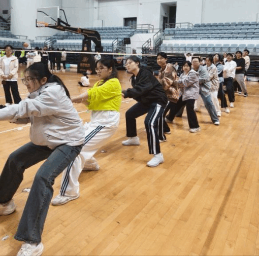 上午的室内体育馆内,生科院拔河队的队员们成为全场的焦点。他们双脚紧蹬木质地板,身体后仰,双手死死攥住粗绳,额角青筋凸显,每一寸绳索的争夺都凝聚着全队的默契与力量。场边,写有“为生科疯狂 打call”的卡通宣传牌格外醒目,可爱的欢呼小人与“我爱你”“LOVE”等字样传递着师生们的热烈助威。尽管对手强劲,但队员们目光坚定,口号震天,每一次发力都引来看台观众的呐喊呼应,将团队协作精神诠释得淋漓尽致。