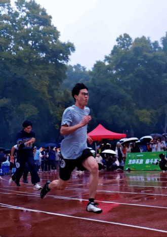 而在红色跑道上,生科院运动员的身影同样引人注目。在短跑项目中,余证通同学身着浅蓝短袖、黑色“8号”短裤,在起跑线前,以标准的蹲踞姿势凝神待发,湿滑的跑道未能削弱他的专注,反而更显挑战面前的沉着。比赛开始后,他在湿润的跑道上奋力奔跑,双臂摆动有力,脚下水花轻溅,最终取得总排第四名的优异成绩。背景中“生命不息 奋斗不止”的绿色横幅恰如其分地烘托出运动员们的信念。