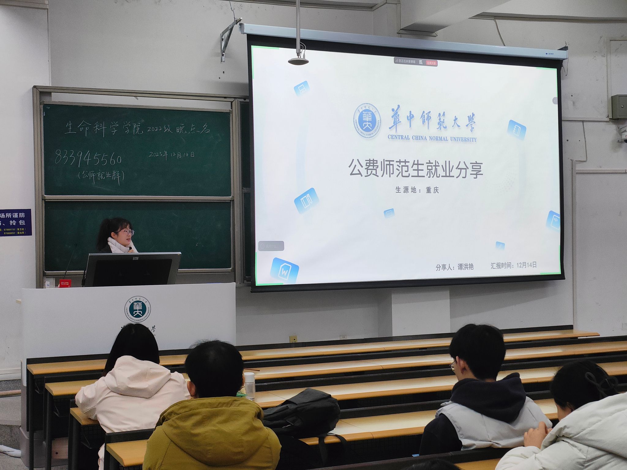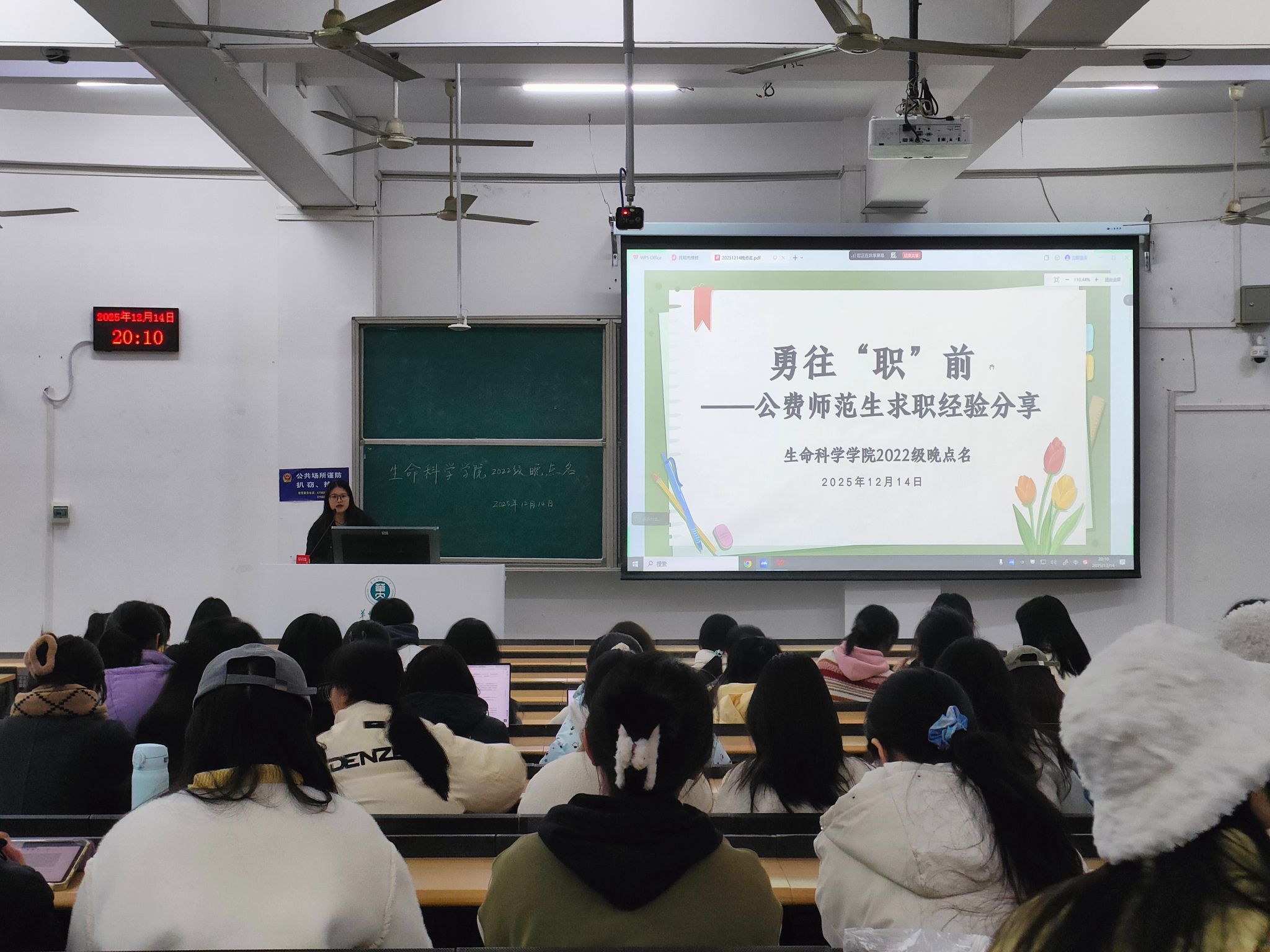华大青年讯(通讯员 吴杰娴)为进一步做好有温度的教育,提升公费师范毕业生的就业竞争力、解答求职困惑,12月14日晚,生命科学学院2022级联合学院乐学生涯教育与就业指导中心,举办“勇往‘职’前”主题晚点名分享会。活动由2022级辅导员宋浩楠主持,生命科学学院2024级学科教学(生物)卓师班成员邹梓健、2021级河南省公费师范生冉怡雯、2022级重庆市公费师范生谭洪艳三位主讲人分别就招聘流程、面试技巧等分享了自己在教师招聘及求职过程中的宝贵经验。