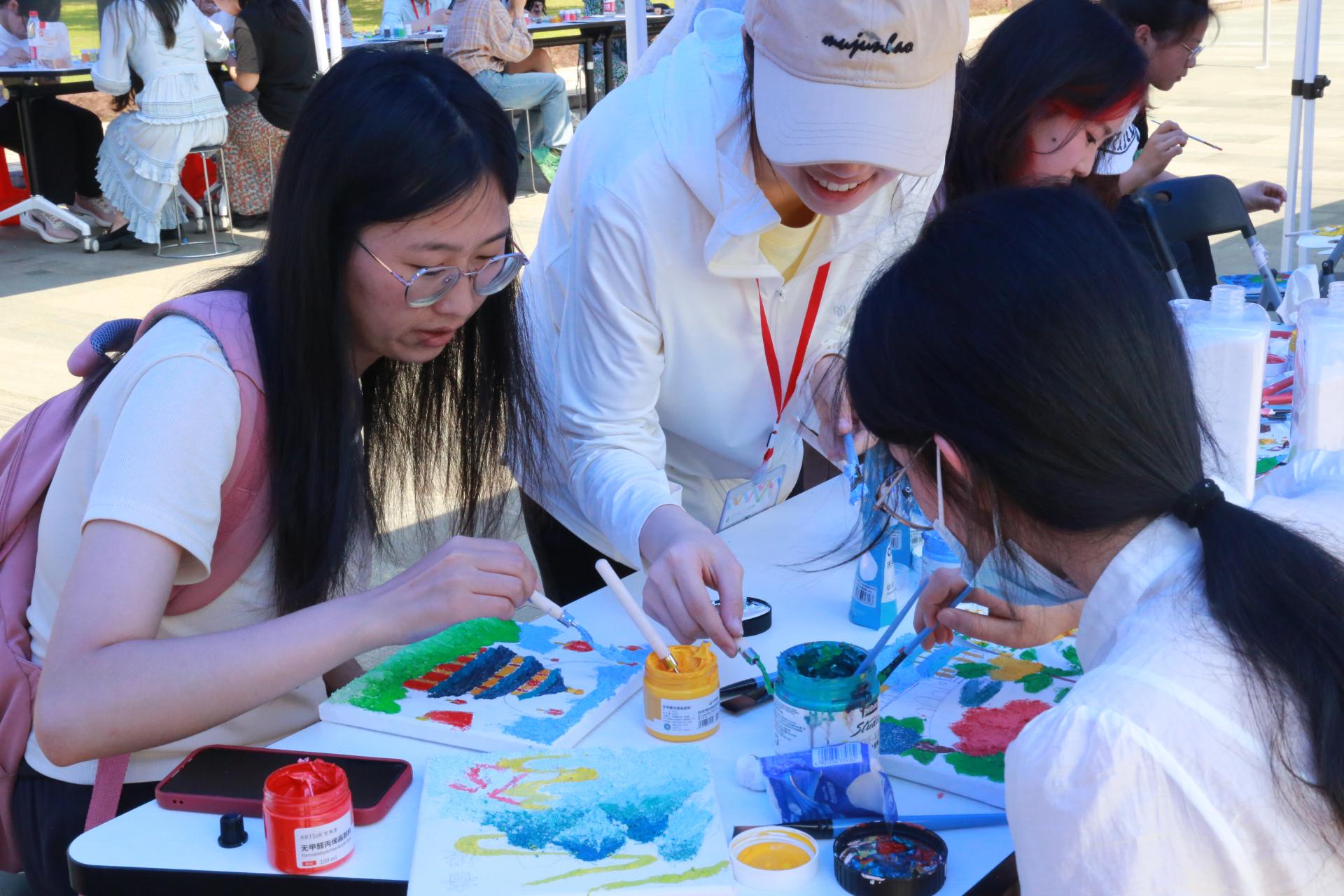 在艺术体验区,同学们参与热情高涨。该区域共有掐丝珐琅工艺制作、石英砂画、漆扇制作和百变扭扭棒四种艺术体验活动。活动开放期间,共有近400名师生前来参观,并积极参与艺术体验活动。
