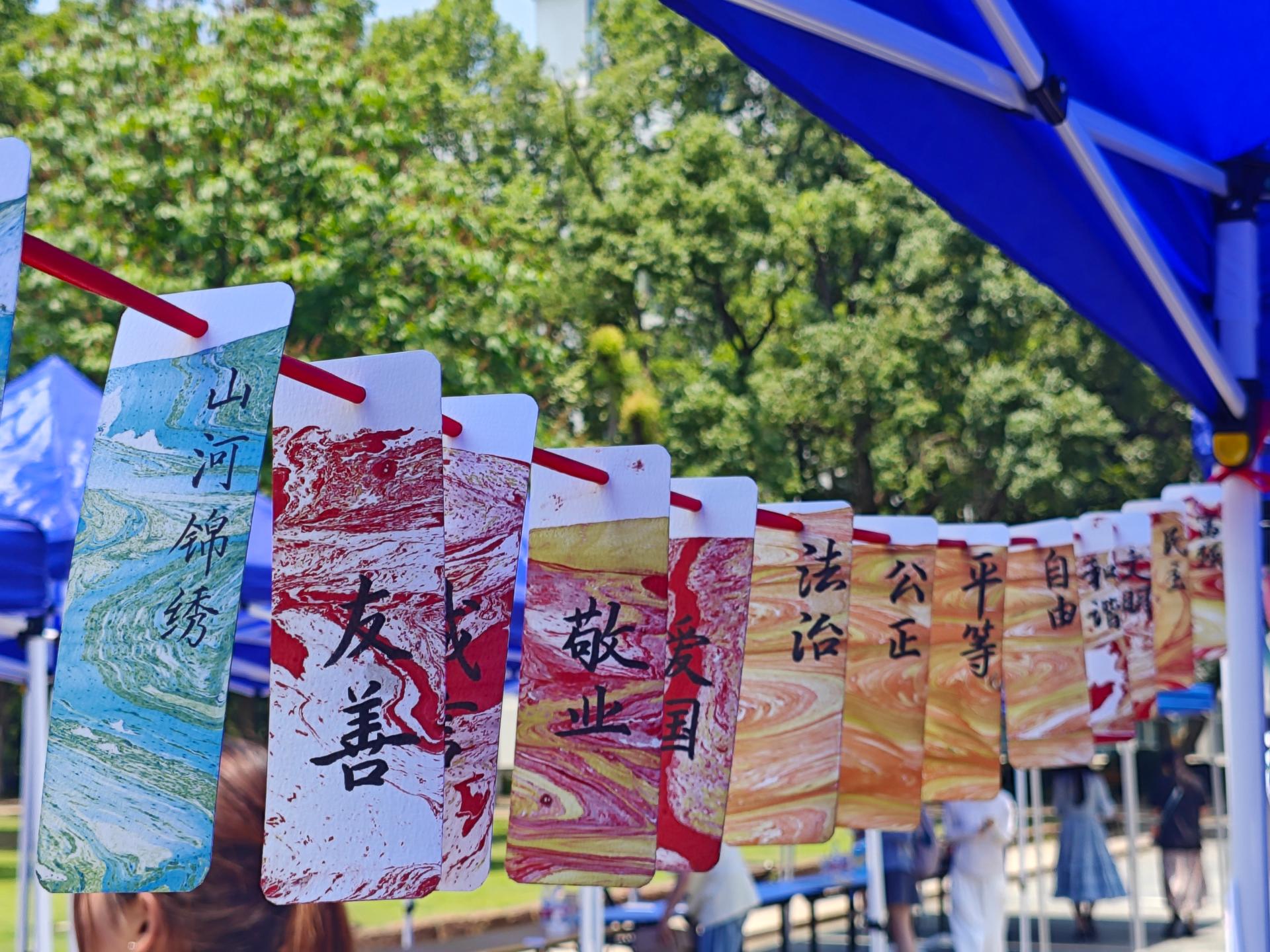 在排起长龙的漆扇展位,大家将植物漆滴入水中慢慢搅动,放下纸扇浸入其中,随即在色彩的碰撞和水波的流动中制成一把把不可复刻的精美小扇,感受丹青画意和中国传统美学。工作人员还指导大家制作社会主义核心价值观漆扇书签,并举爱国和美育,随风飘扬的书签,体现着大家心中对祖国涌动的爱意。在百变扭扭棒体验区,扭扭棒在参与者灵巧的双手里充满无限可能,尽显大家天马行空的想象力和无与伦比的创造力。
