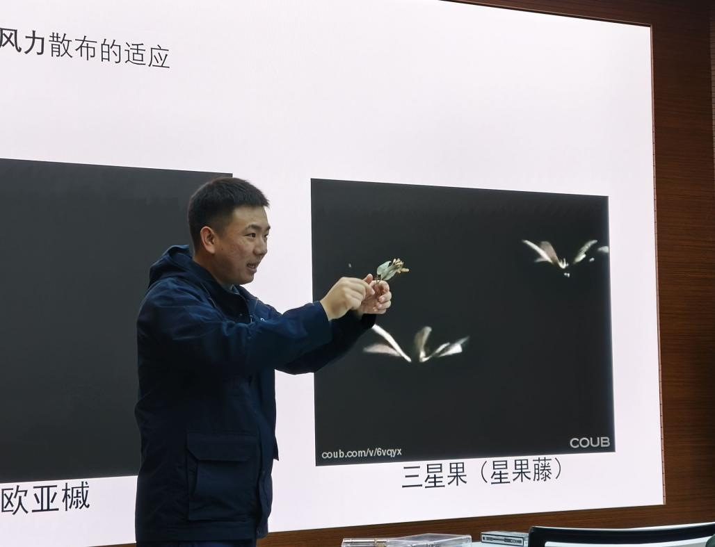 随后,田志夕结合仿真模型等教学用具,形象地介绍了种子传播的四种方式:风力传播、水力传播、动物传播、自体传播。他强调,种子传播方式没有优劣之分,每种植物为了延续他们的后代耗费了大量“心血”,希望同学们能在生活中观察自然,真正了解并爱护我们身边的植物。