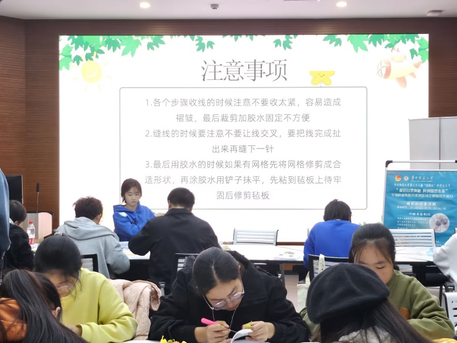 苔藓杯垫生物实践体验活动中,工作人员结合图文向同学们细致地展示了杯垫制作的具体步骤和操作中的注意事项。随后,同学们打开材料包,用手机扫描材料包中附带的二维码,一边学习制作教程,一边开始了自由动手创作。在活动过程中,同学们全身心投入其中,在一针一线里感受手工制作带来的宁静,制作出许多精美的作品。