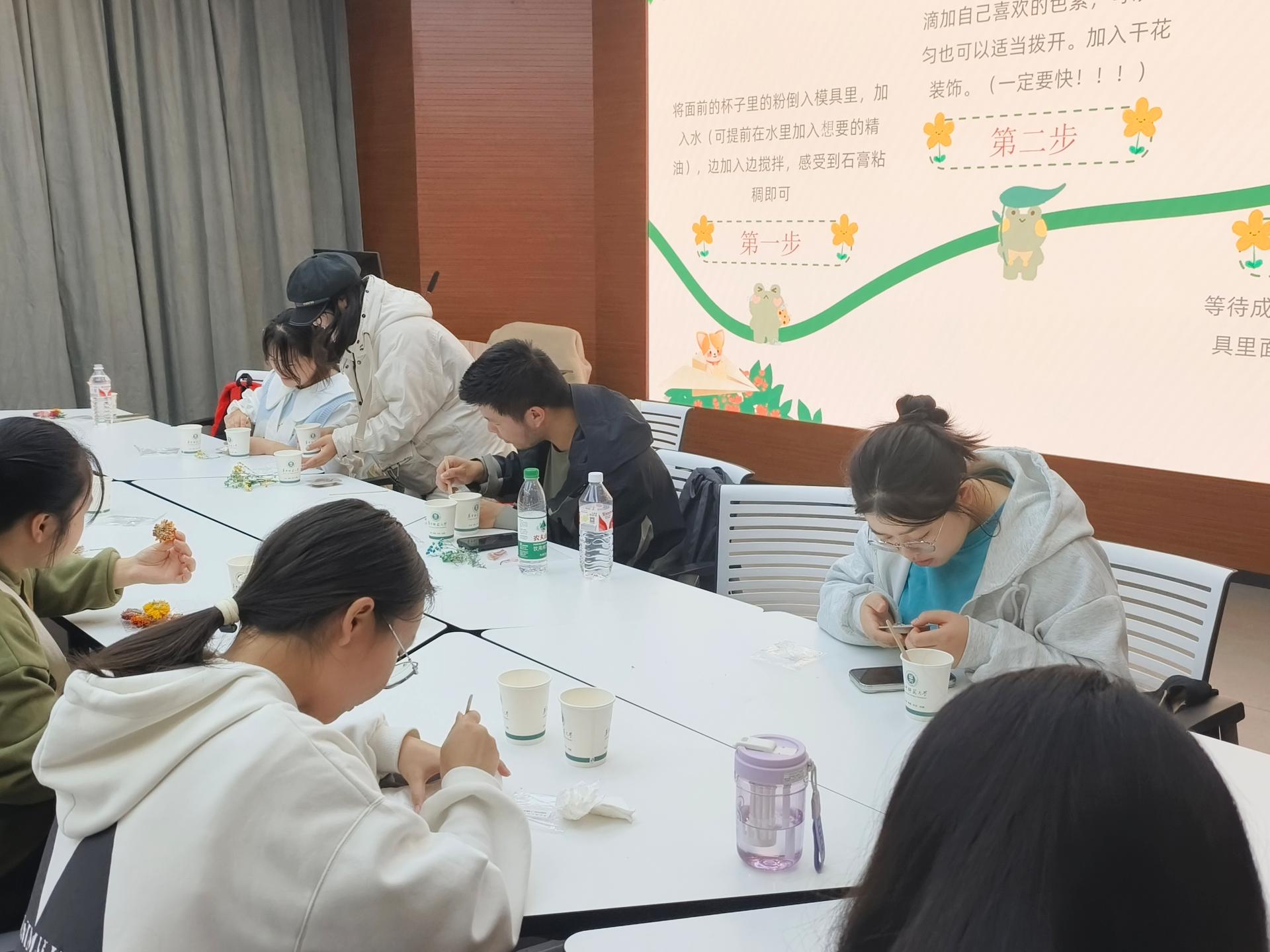 在植物香薰活动中,同学们依次向模具中加入石膏粉、水、精油和色素,并在半干状态下放入干花装饰,制成美丽清香的植物石膏香薰。随着石膏慢慢凝固,流动融合的色素线条和精巧的装饰干花也逐渐定型。同学们利用各式各样的模具,以各具特色的设计巧思对石膏进行装点修饰,最后用麻绳棉线或蕾丝带包裹住石膏边缘,制成一个个精致的石膏香薰。随着精油的挥发,石膏香薰散发出沁人心脾的香气,让同学们感受生物的魅力。